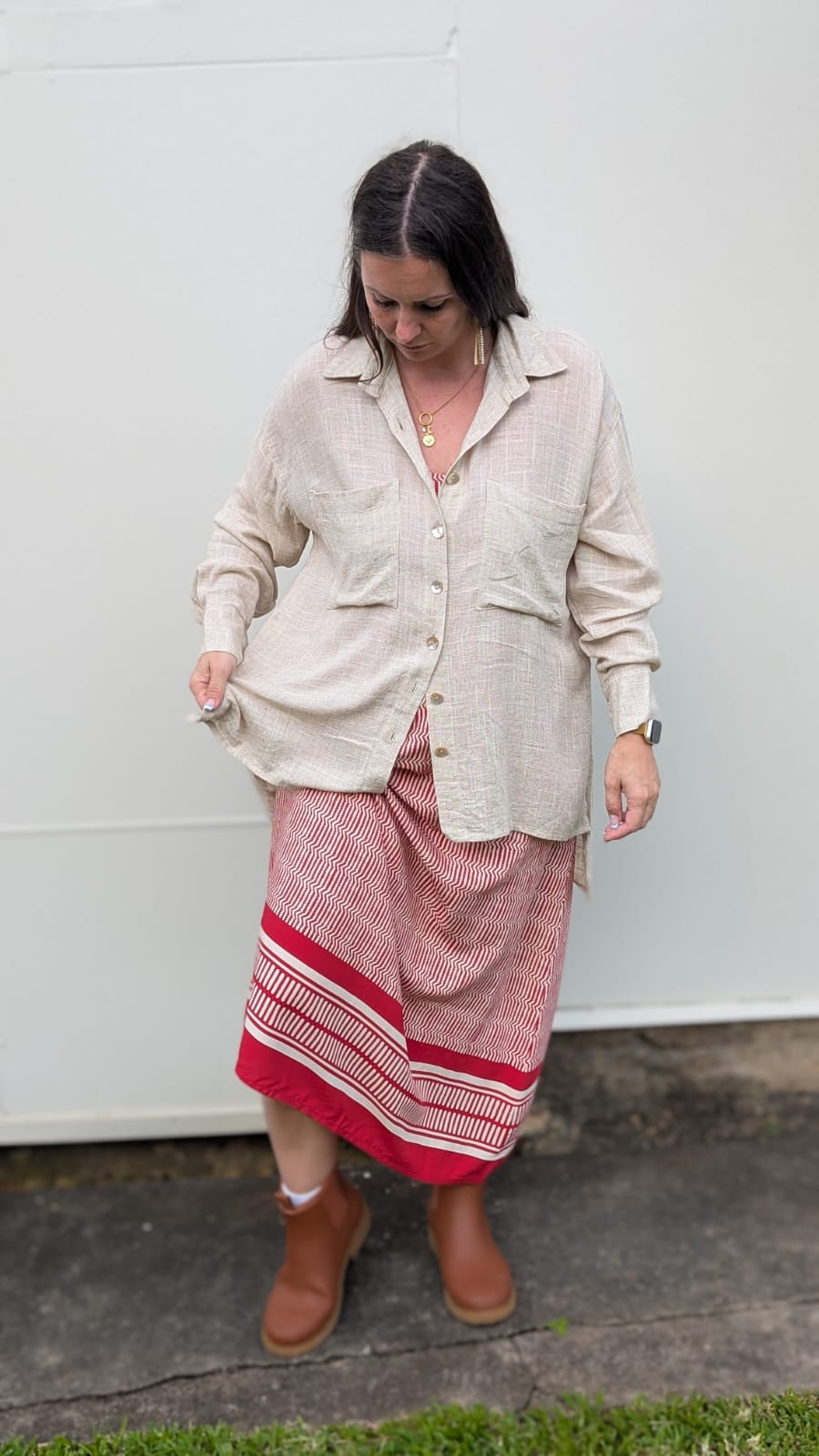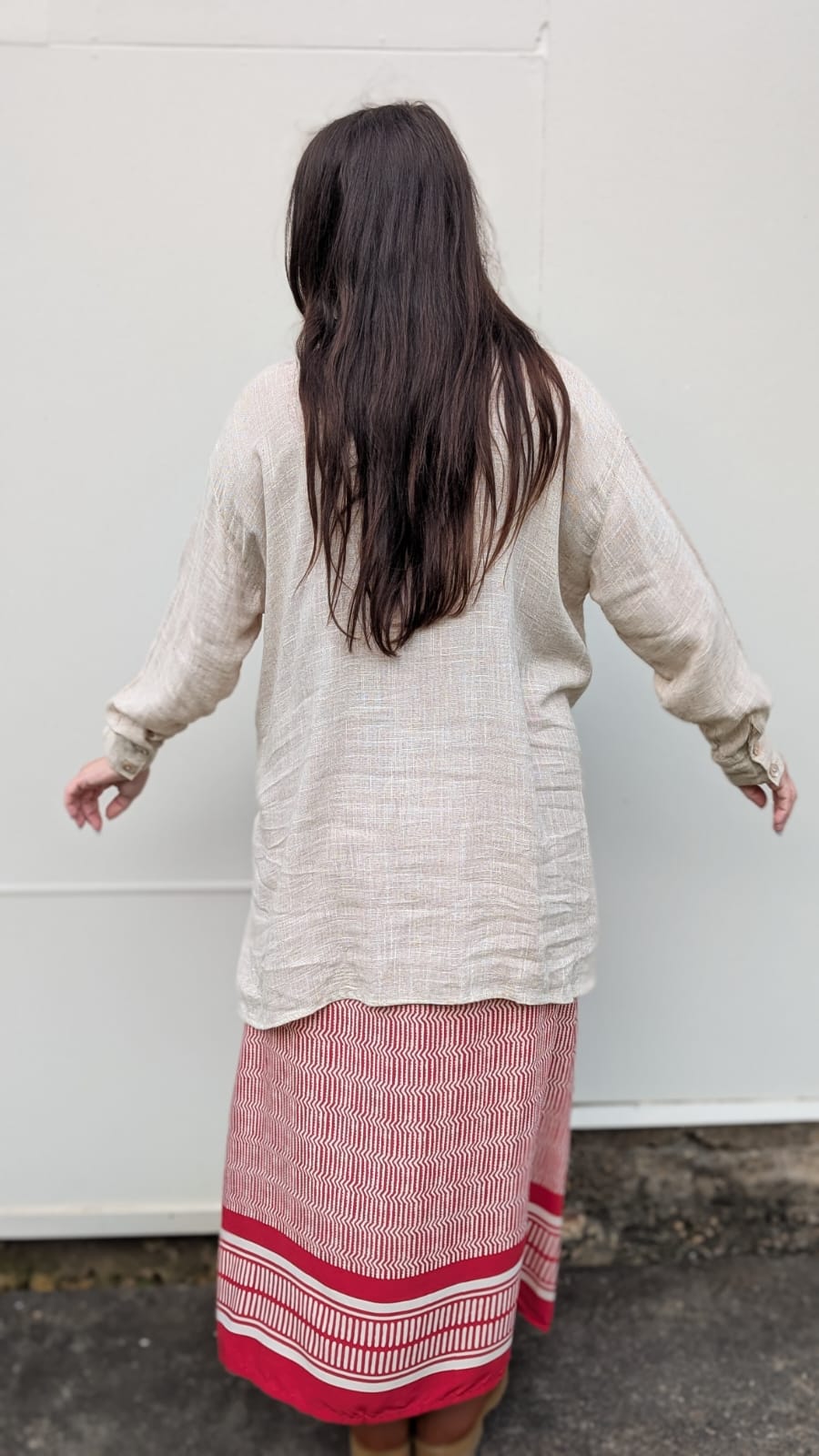 Loose fitting extremely versatile long sleeved oversized boyfriend shirt. Featuring shell buttons, patch pockets and mullet length tailoring (short at the front, long at the back). Great layering piece that can be worn with short, pants, skirts and dresses. Tucked in or worn loose for an easy carefree look.