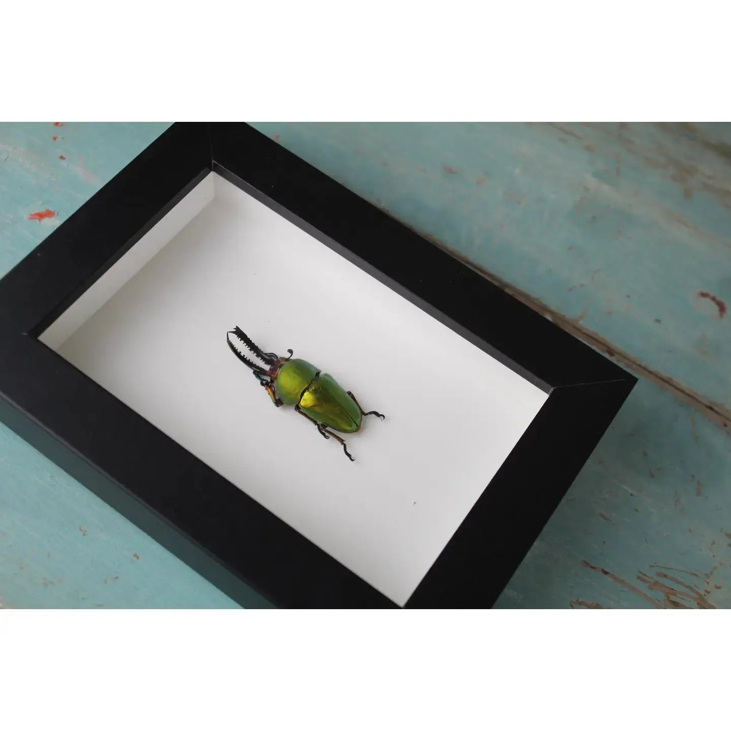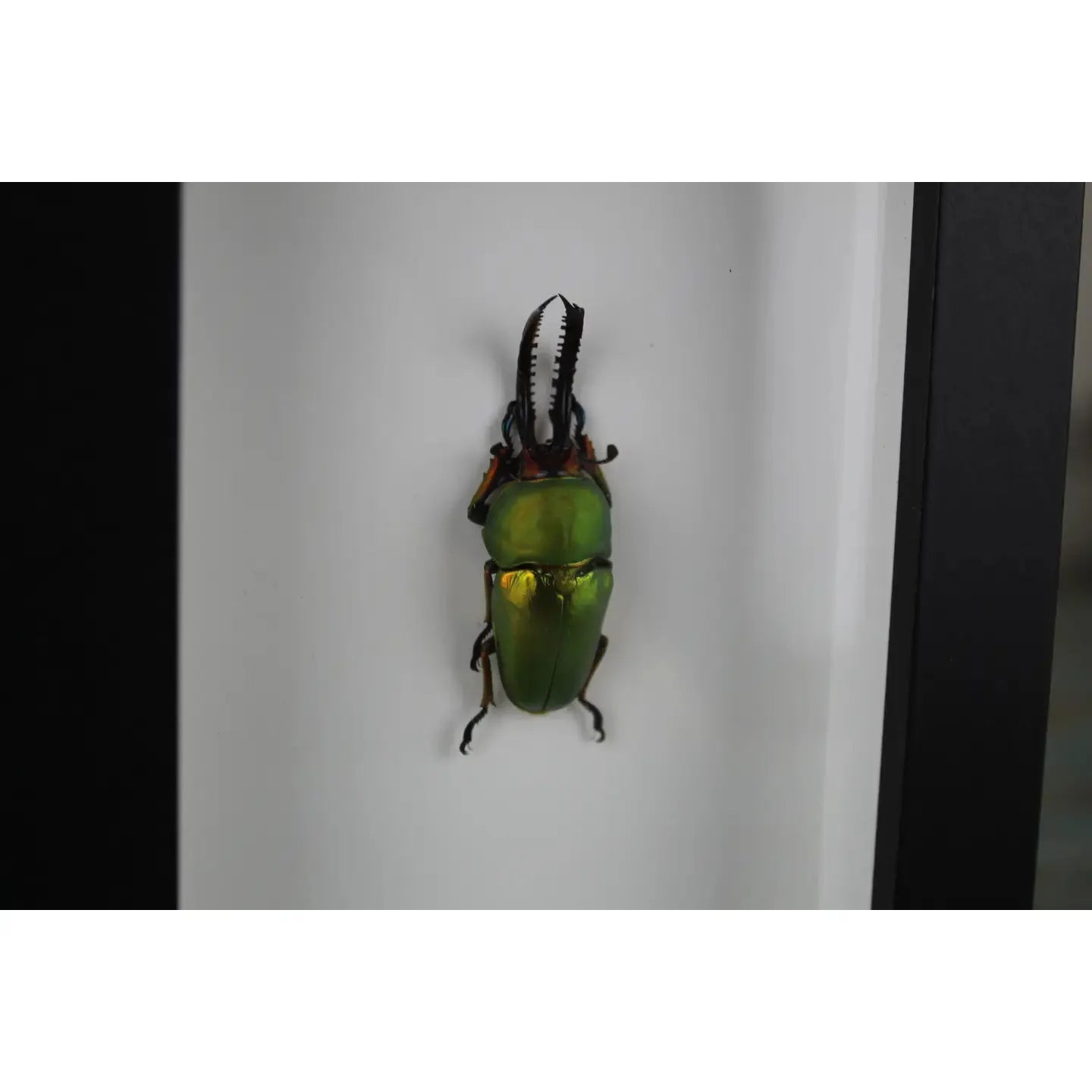 Species Name: Lamprima adolphinae Common Name: Green Stag Beetle Origin: Indonesia Size: 4 x 6" Black Shadow Box Frame The iridescence is so brilliant in these beetles.