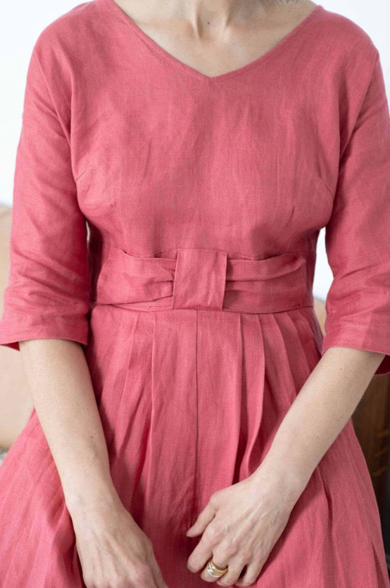 Wide V neckline, lightly fitted bodice and bat wing narrow, 3/4 length sleeves.