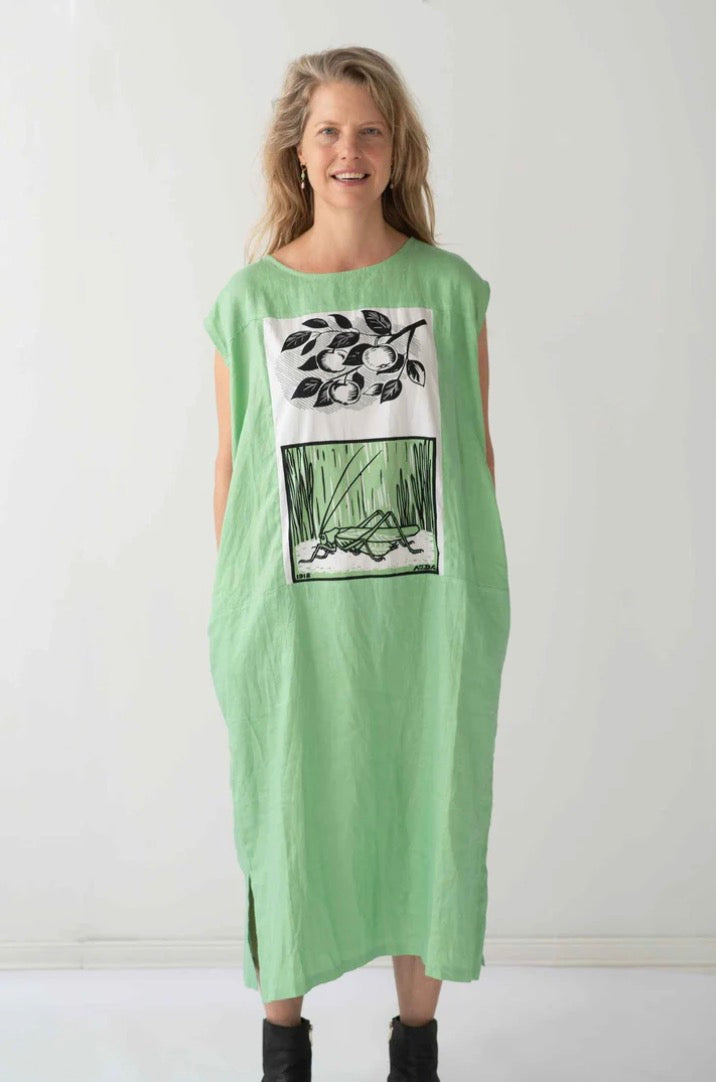 Description: This refreshing, relaxed-fit dress by Lazybones Australia is made from 100% organic cotton, designed for ultimate comfort and ease. The soft, light green fabric creates a fresh and calming look, perfect for casual outings. Featuring a wide round neck and capped sleeves, it offers a loose, easy fit available in two sizes. The front panel is adorned with two eye-catching black and white screen-printed designs inspired by vintage woodcuts—one depicting fruit-laden branches and another of a grasshopper nestled among blades of grass—bringing a modern, artistic touch. The straight-cut silhouette, coupled with the breezy material, makes this piece a versatile and eco-friendly wardrobe staple. Inseam pockets add functionality without compromising the clean lines of the design. Perfect for layering over a long-sleeve t-shirt, turtleneck, or comfy cardigan for added warmth and style.