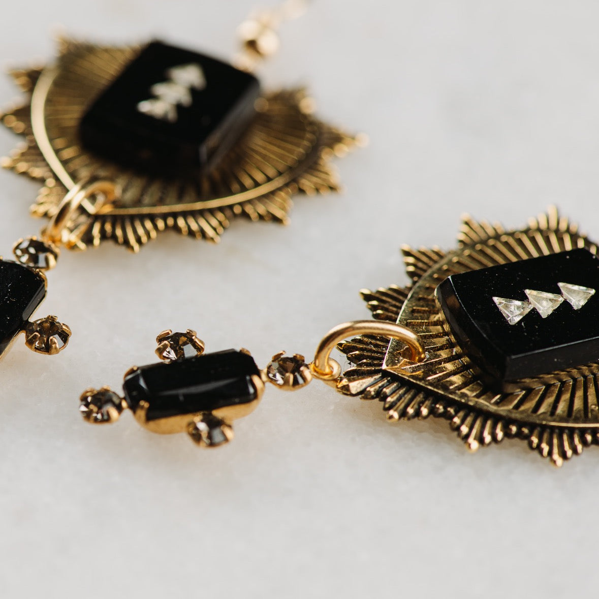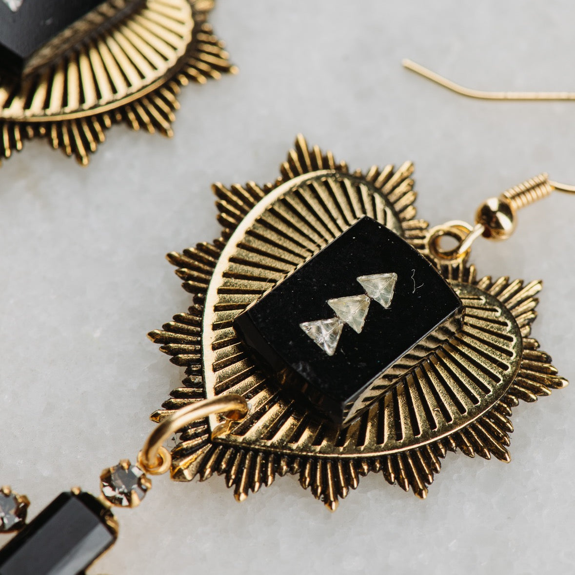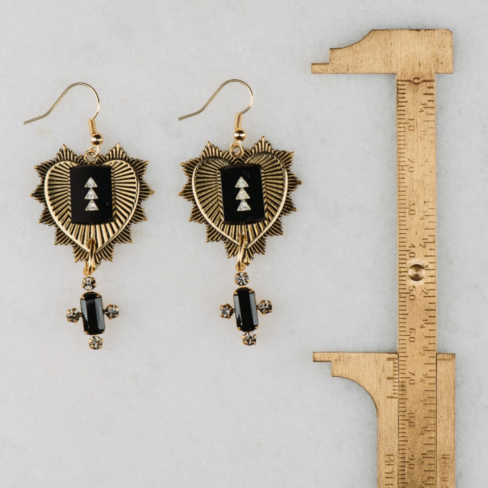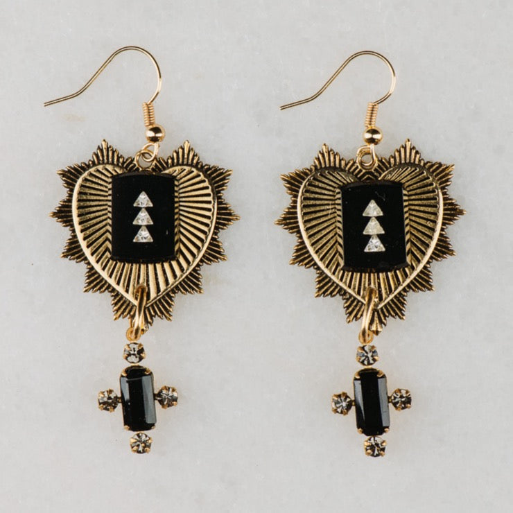 The dark Golden Hearts are caressed with a beautiful vintage Art Deco diamanté' Jewel with arrows going up to heaven. With a rare vintage renaissance style jewelled cross dropped below. 18 carat gold plated earpost.