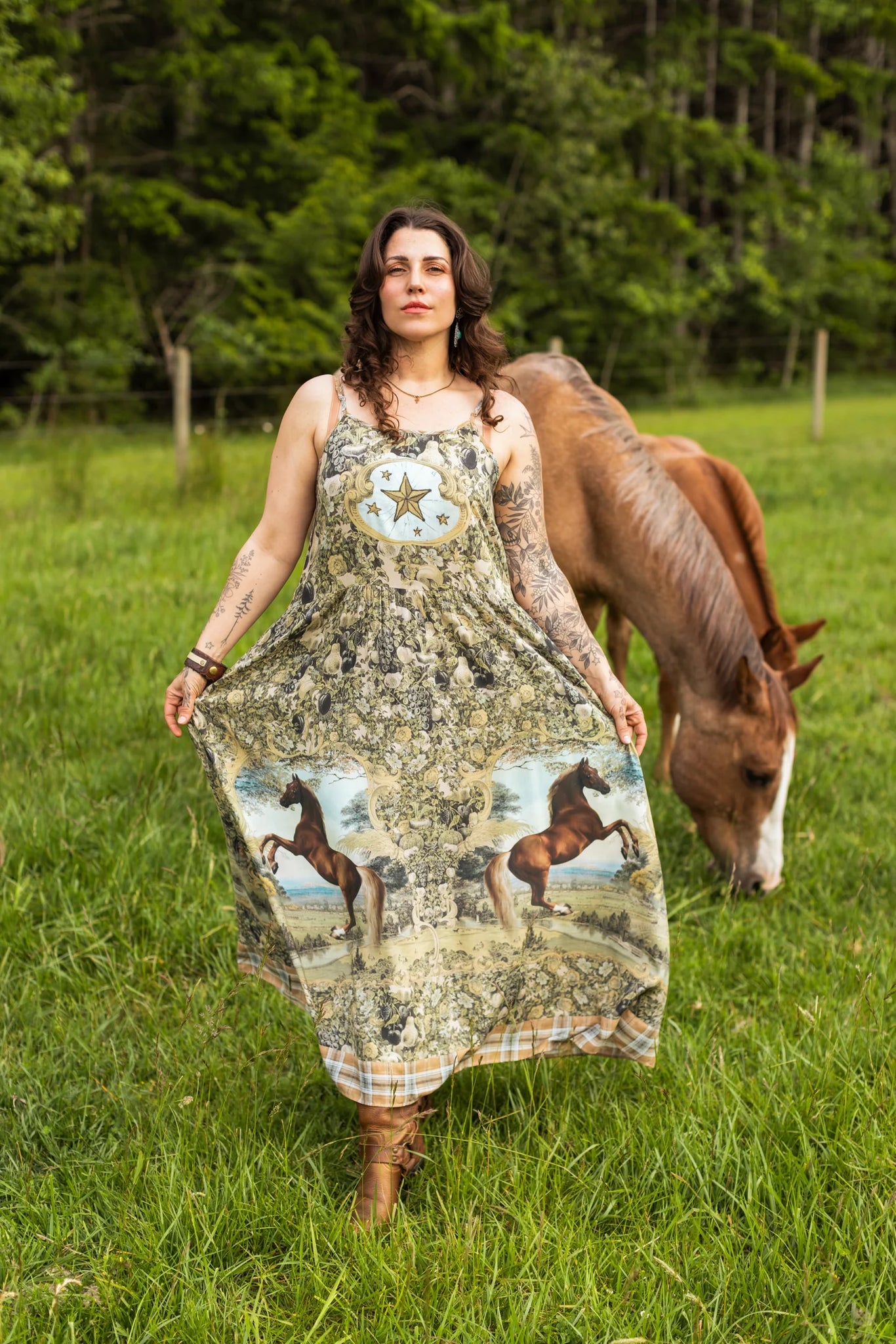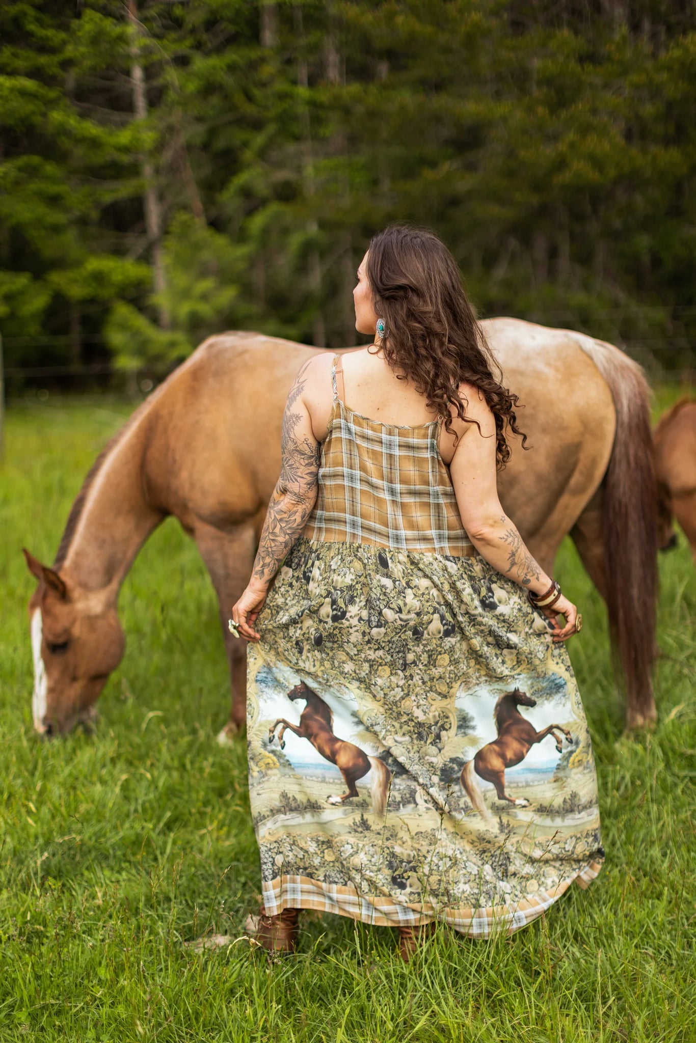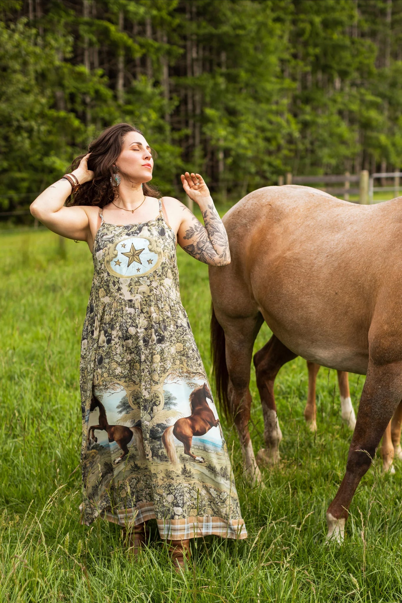 All good things are wild and free! Created to celebrate the unbridled spirit of adventure, Born to Run blends vintage-washed, heritage prints with the untamed energy of two rearing racehorses by British painter George Stubbs. The antique banners, etched with mottos of rebellion like “Don’t Fence Me In”, are our spirited nod to the wild west and the open road. The beautiful, airy backdrop behind the horses is actually a scenic lithograph from the 1897 World’s Fair, and the faded florals and golden wheat were taken from an 1800’s farmers diploma. The pen-and-ink stars and upturned horseshoe are also antique drawings from the same era. And as a final, playful touch, we added a prancing mother horse and foal — a symbol of unbound freedom and joy. The bodice and trim is a washed heritage plaid, reminiscent of sun-faded chambray and days at home on the range :)