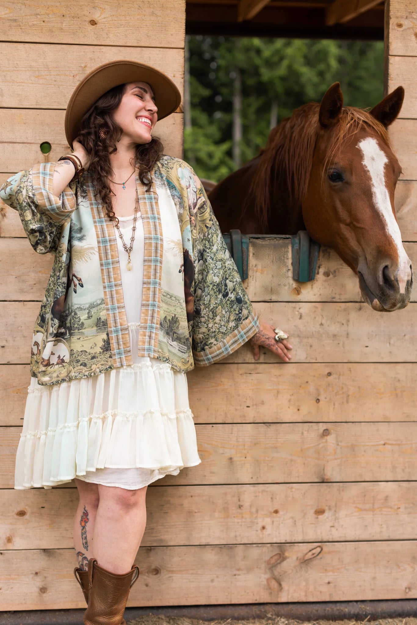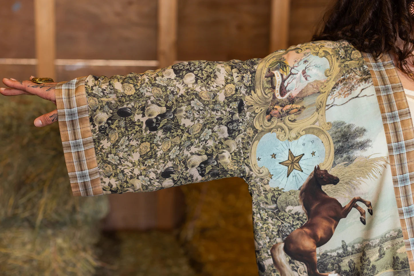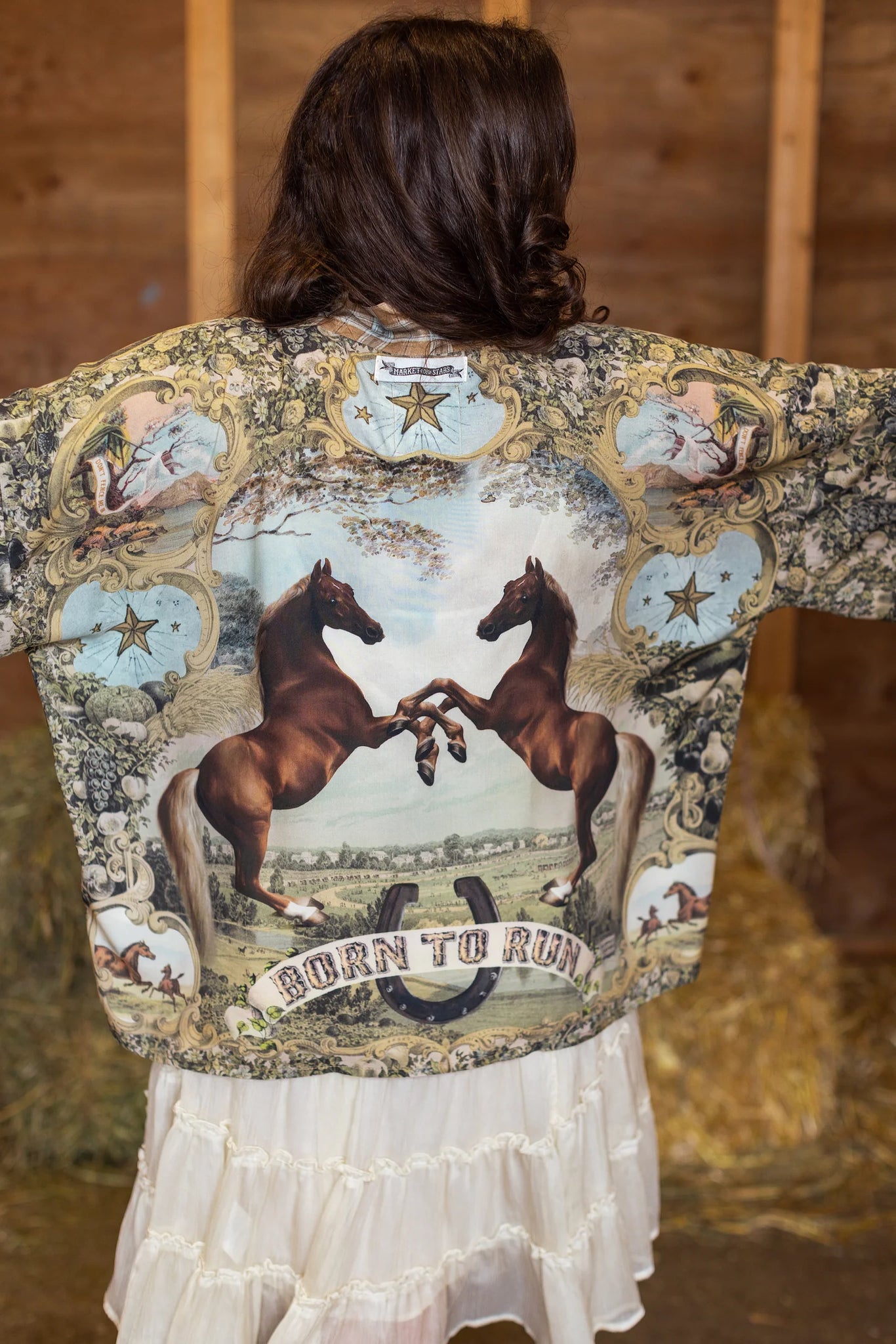 All good things are wild and free! Created to celebrate the unbridled spirit of adventure, Born to Run blends vintage-washed, heritage prints with the untamed energy of two rearing racehorses by British painter George Stubbs. The antique banners, etched with mottos of rebellion like “Don’t Fence Me In”, are our spirited nod to the wild west and the open road. The beautiful, airy backdrop behind the horses is actually a scenic lithograph from the 1897 World’s Fair, and the faded florals and golden wheat were taken from an 1800’s farmers diploma. The pen-and-ink stars and upturned horseshoe are also antique drawings from the same era. And as a final, playful touch, we added a prancing mother horse and foal — a symbol of unbound freedom and joy. The whole design is trimmed in a washed heritage plaid, reminiscent of sun-faded chambray and days at home on the range :)