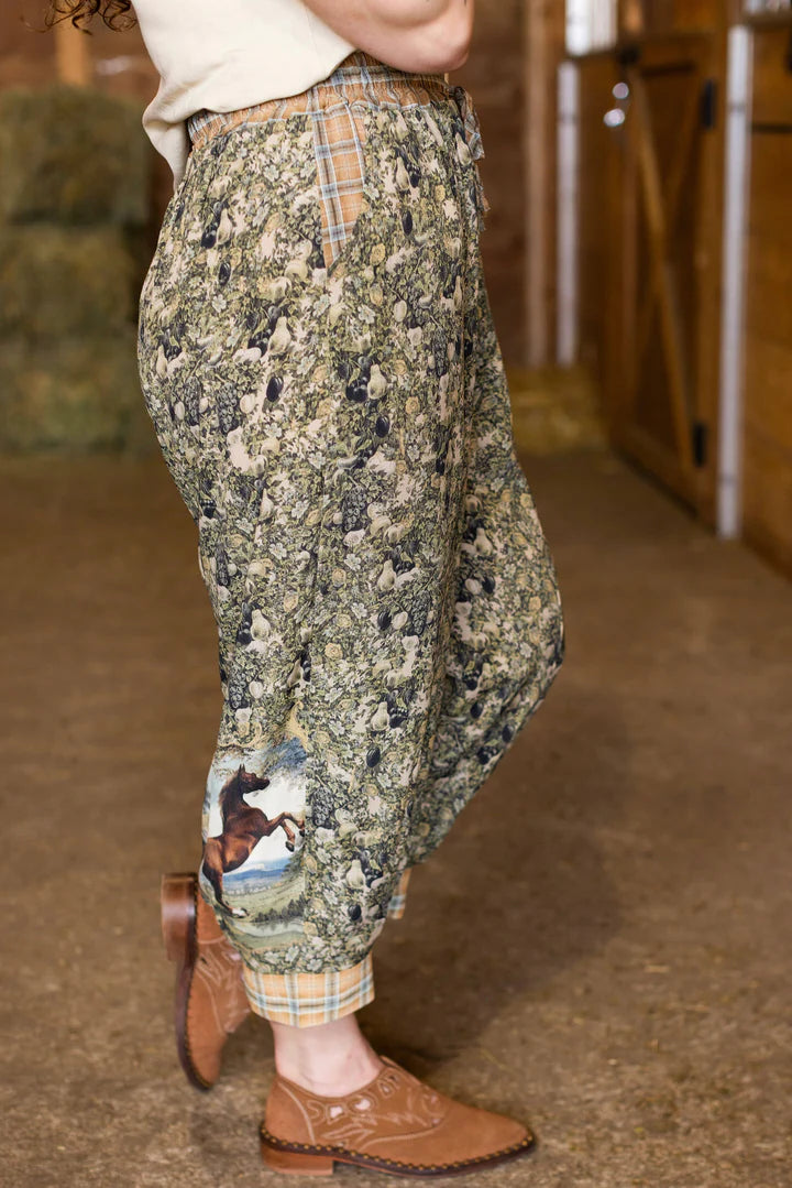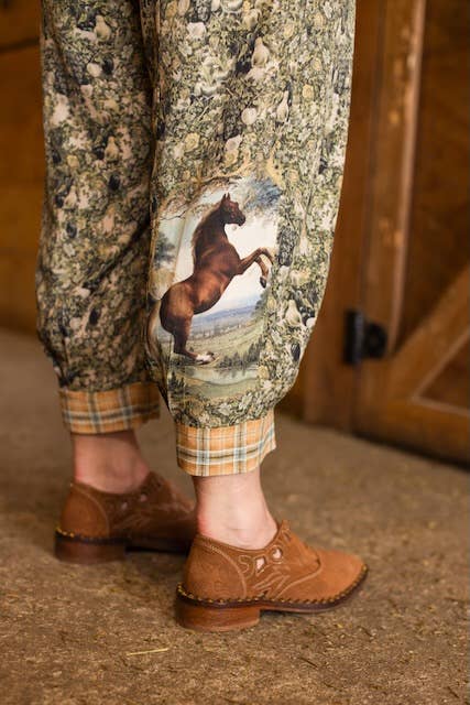 About the Print: All good things are wild and free! Born to Run celebrates adventure with vintage prints, rearing racehorses, and banners like “Don’t Fence Me In.” Scenic backdrops, faded florals, and playful horses evoke freedom, joy, and the spirit of the open road! 100% viscose. Handwash, reshape and iron while damp. Or dry clean.