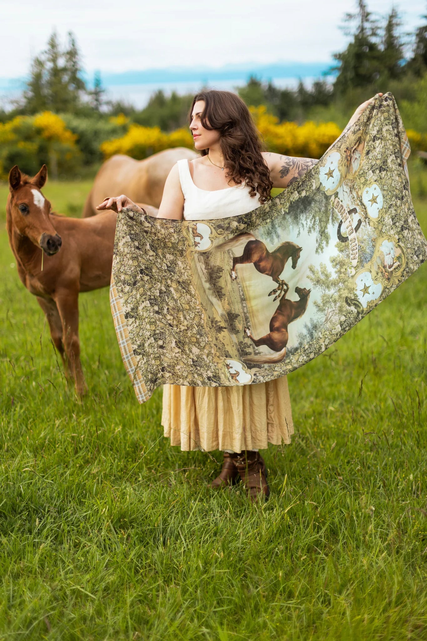 Created to celebrate the unbridled spirit of adventure, Born to Run blends vintage-washed, heritage prints with the untamed energy of two rearing racehorses by British painter George Stubbs. The antique banners, etched with mottos of rebellion like “Don’t Fence Me In”, are our spirited nod to the wild west and the open road. The beautiful, airy backdrop behind the horses is actually a scenic lithograph from the 1897 World’s Fair, and the faded florals and golden wheat were taken from an 1800’s farmers diploma. The pen-and-ink stars and upturned horseshoe are also antique drawings from the same era. And as a final, playful touch, we added a prancing mother horse and foal — a symbol of unbound freedom and joy. The whole design is trimmed in a washed heritage plaid, reminiscent of sun-faded chambray and days at home on the range :)