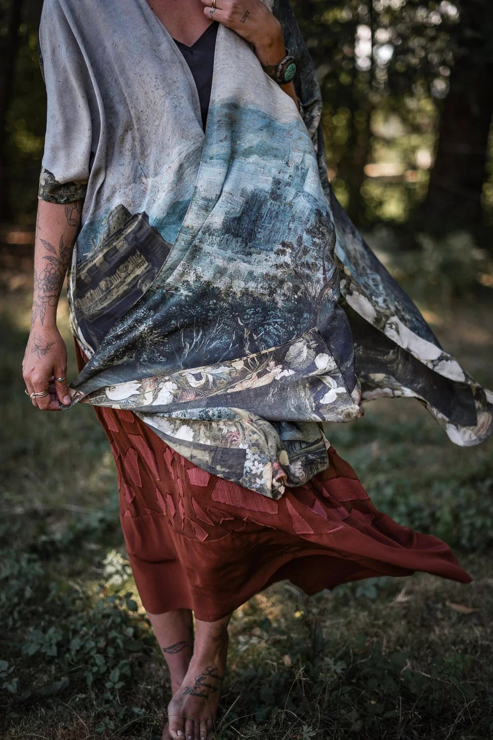 Based on a lush and magical painting from the 1600’s by artist Jan Brueghel titled “Imaginary Landscape”, this kimono is a true flight of fancy! Using Brueghel’s masterpiece, we layered in elements from French artist Hubert Robert, including the classical ruins and a girl swinging joyfully through the trees. To add even more richness, we trimmed the entire design in vintage painterly florals.
