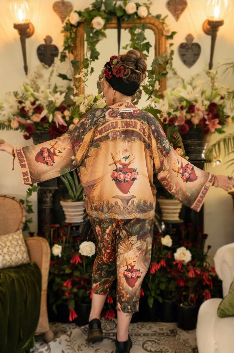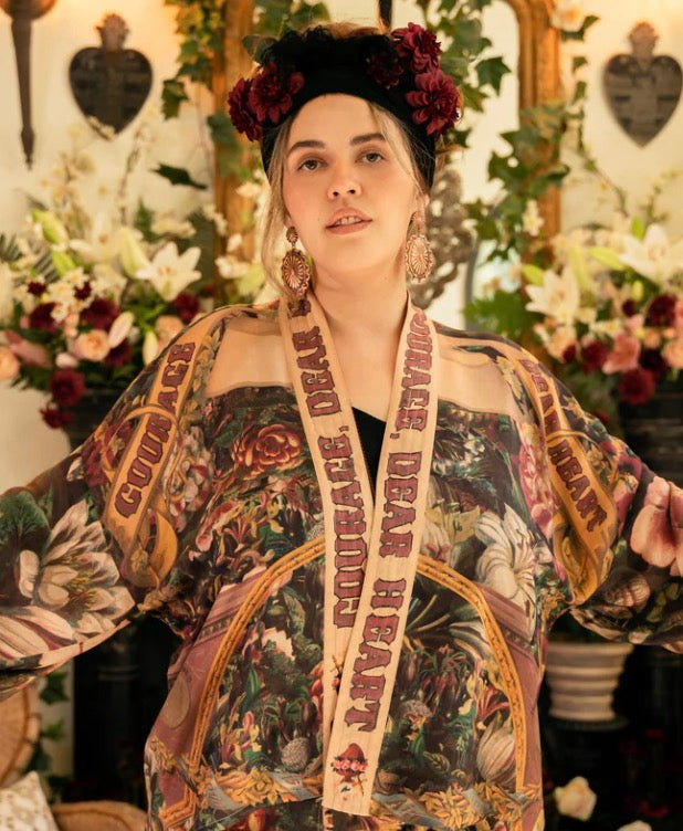 Love, faith, and courage — we designed this piece as a reminder to keep all three close when the road feels long! This beautiful, dramatic print was created using archival artwork from the 1800’s — including floral wreaths & fountains from Victorian lithographs, and an 1878 hand-coloured Sacred Heart illustration. The words “Love is an arrow, aim true”, and “Where your treasure is, there your heart will be also”, are hidden in the design as little talismans of strength. The words “courage, dear heart”, repeated on the trim, were inspired by a quote from C.S. Lewis — the author of the Narnia Chronicles. The result is a dramatic and rich print that we hope will encourage you to give yourself grace, celebrate your tenacious spirit, and always, always take heart.