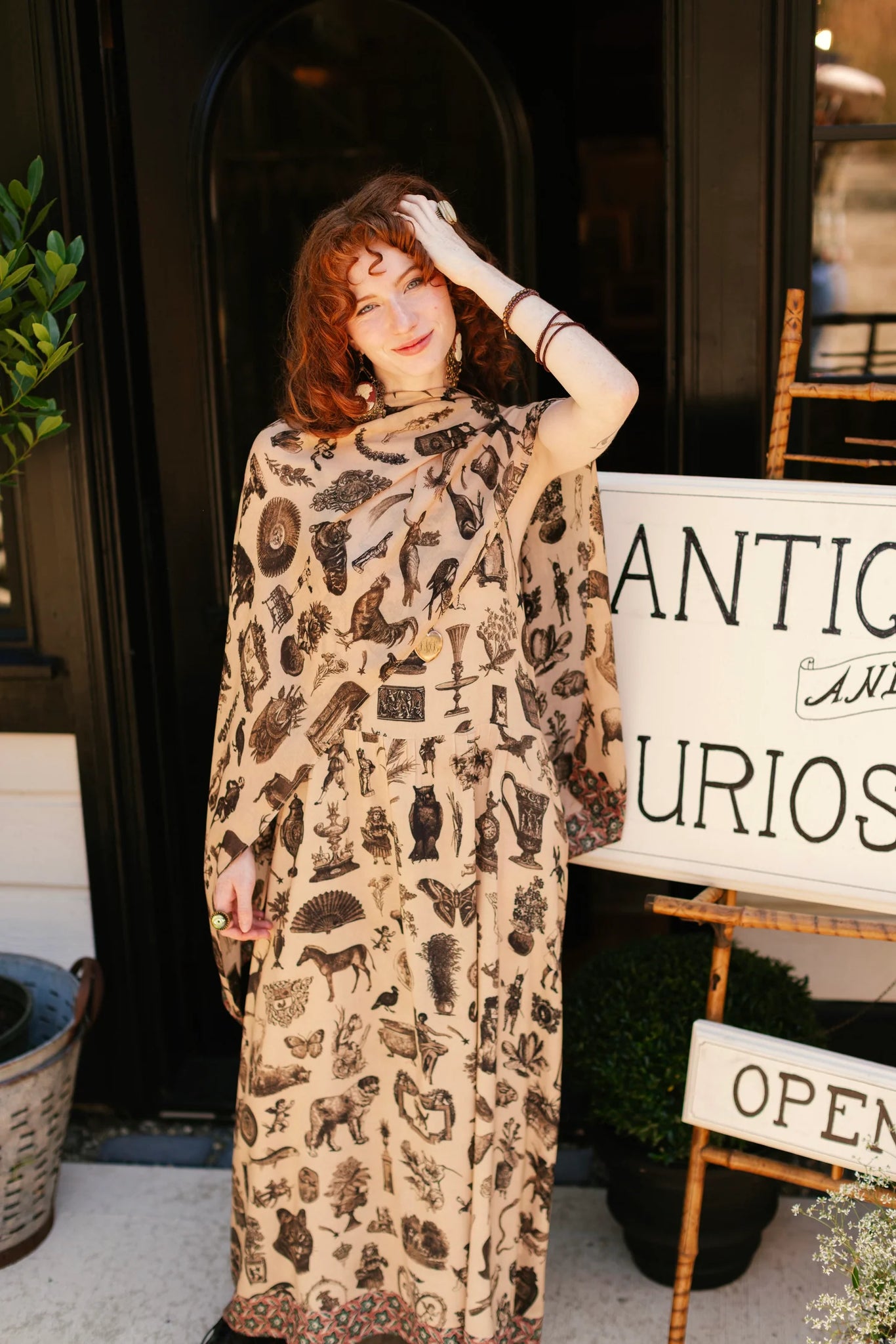 Some designs at Market of Stars begin as secrets (with no real plans to release them), created simply because we want to wear them ourselves! Curiosities was one of those printsāuntil we shared it online and were met with an outpouring of love. Our Stargazer community wanted it too, so here it is: a print born from the pages of a mysterious Victorian scrapbook kept by an unknown woman in Paris around 1870. Within its worn pages, she carefully clipped and collaged hundreds of fragments of her worldādelicate bouquets, elegant vases, shooting stars, birds in flight, and a delightfully startled cat who seemed to demand a place in our design :)