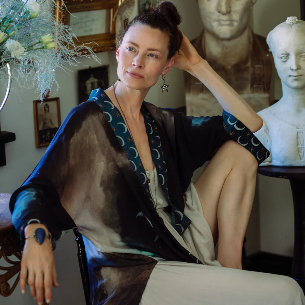 This luscious kimono starduster is a celebration of the moon and her goddesses! The piece is based on a painting of Georgiana Spencer (the great, great, great, great aunt of Diana, Princess of Wales), who commissioned Maria Cosway to paint her as the Moon Goddess from the poem The Fairie Queen. Georgiana was a scandalous writer, activist, and fashion icon; perfect as a role model today! The flowy style is perfect for all shapes and sizes, and the colors look fabulous on everyone.