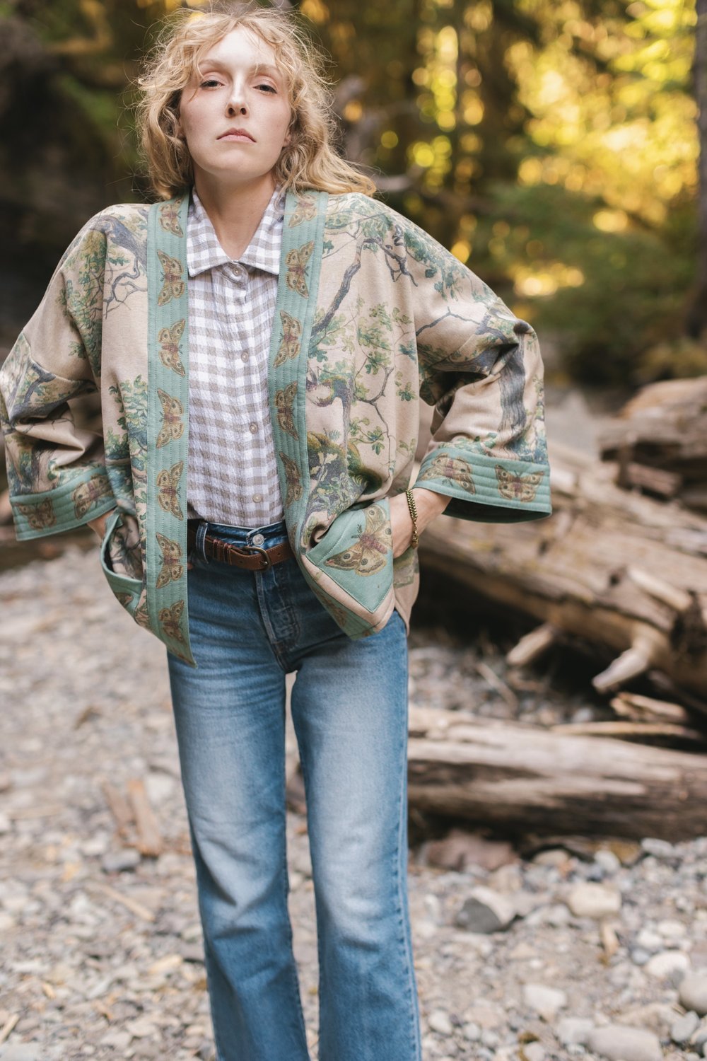 One of our favourite ways to pass the time on a free afternoon is just to lie in the grass and look up at the clouds through the branches of the beautiful old trees that border our headquarters here at Market of Stars. Earth and Sky was created out of a deep appreciation for rare days like these — full of wise ancient trees, and wide open skies! Painted in the late 1800’s by British artist Charles Aston, the palette is a dreamy and meditative play of textures and colours from the natural world. We trimmed Aston’s magnificent tree with moths painted in the 1600’s by Dutch master Melchior d’Hondecoeter. The result is airy and ethereal, and so easy to wear.