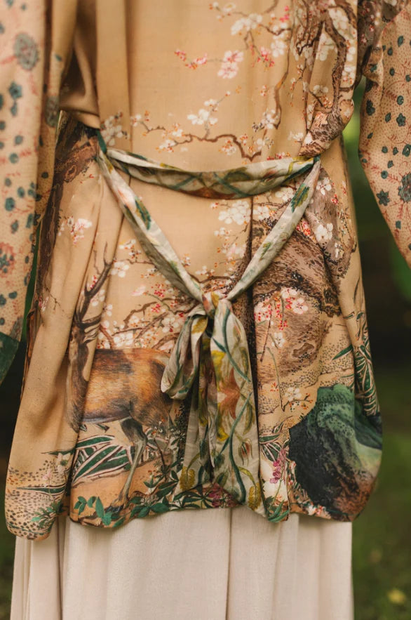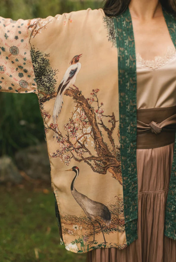 This captivating print is a blend of the classic and the fanciful (just like all good stories), and was created using artwork spanning more than three centuries. We layered two stunning 18th century ink-on-silk hanging scrolls from Japan painted with wild plum blossoms, peach trees, magpies, and a luminous moon to create this design, then added other whimsical elements — including Flemish antique illustrations of wild deer, birds, and cranes. The printed trim comes from French silk embroidery fragments from the early 1800’s, and the charming pattern on the sleeves is a replica of block-printed French paper from the same era. The result is chic, romantic and timeless. 100% viscose (derived from plant fibres such as wood and bamboo). Machine wash gentle or handwash and hang to dry. Kimono meaurements: length 78cm, width (across back, underarm to underarm) 74cm.