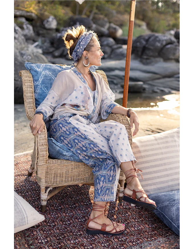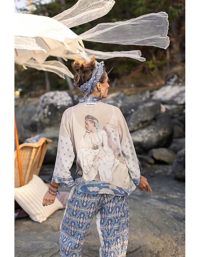 The custom-woven fabric is easy-care for and so comfy. They are one-size and will fit approximately size 4/6 (S) to size 10/12 (L). About the print: Dreamy and delightful, the Head in the Clouds design was created using a portrait — “The Painter’s Wife” by Jean-Etienne Liotard. Market of Stars used the painted fabric details in Liotard’s work to create this design, including the stars on the pillow for the front panel and the Turkish rug for the trim. We love these paired with the matching kimono or a denim jacket!