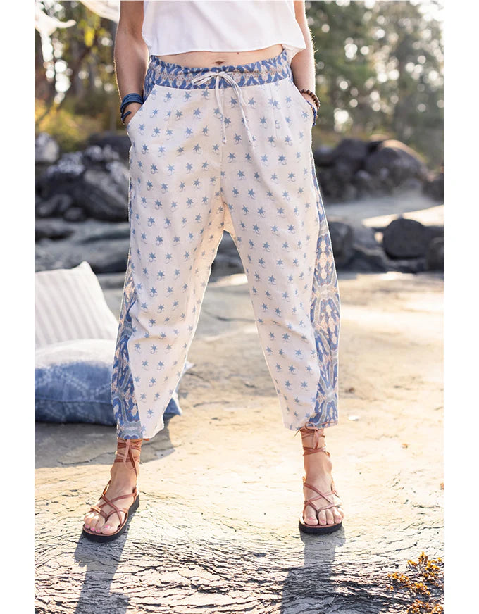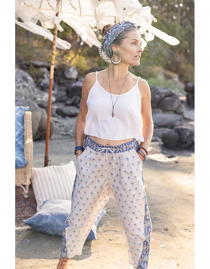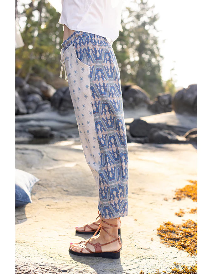 These gorgeous Artist Pants are made from a natural blend of linen and bamboo/wood viscose, & feature a drawstring front, elastic waist back panel, pockets, cropped length, and a flattering lantern hem design.