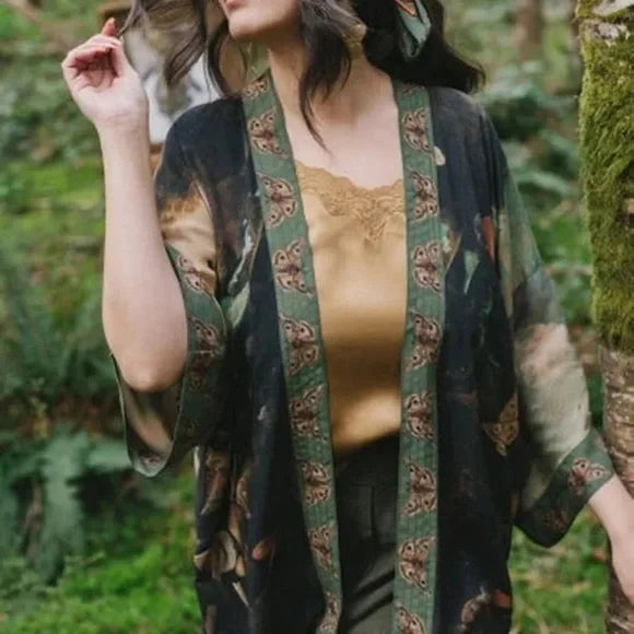 Kimono meaurements: length 78cm, width (across back, underarm to underarm) 74cm. Model is 5’7” for reference.