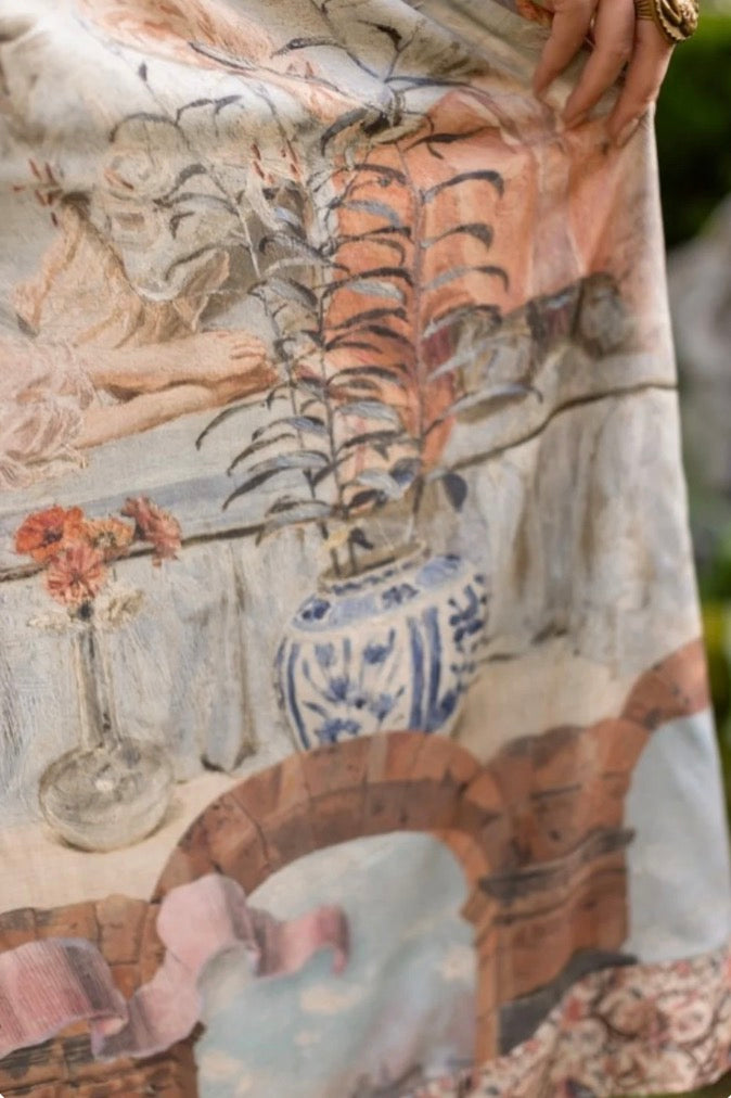 Welcome to the Imaginarium — a whimsical ode to imagination, and the wonder of dreams! Perhaps our most elaborate design yet, we used 9 different works of art layered together to create this romantic & airy print. The sleeping woman comes from Albert Joseph Moore’s enchanting oil painting “Lillies”, while the elements of her dreamscape were created from drawings and paintings spanning three centuries — including scenes from the Boboli Gardens, Argyle House in Scotland, the Tiber River, a Japanese manor house, and a view through the arches of the Roman Colosseum. The 16 candle Chandelier is an imaginary design from a drawing done in 1632, and the fanciful trim is taken from an English textile fragment from 1785. Whatever the realities of life may be, we’ll always dwell in our own little dreamworld — come join us ;)