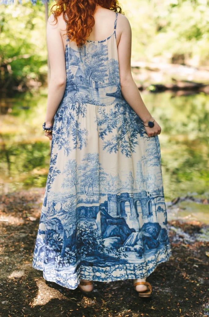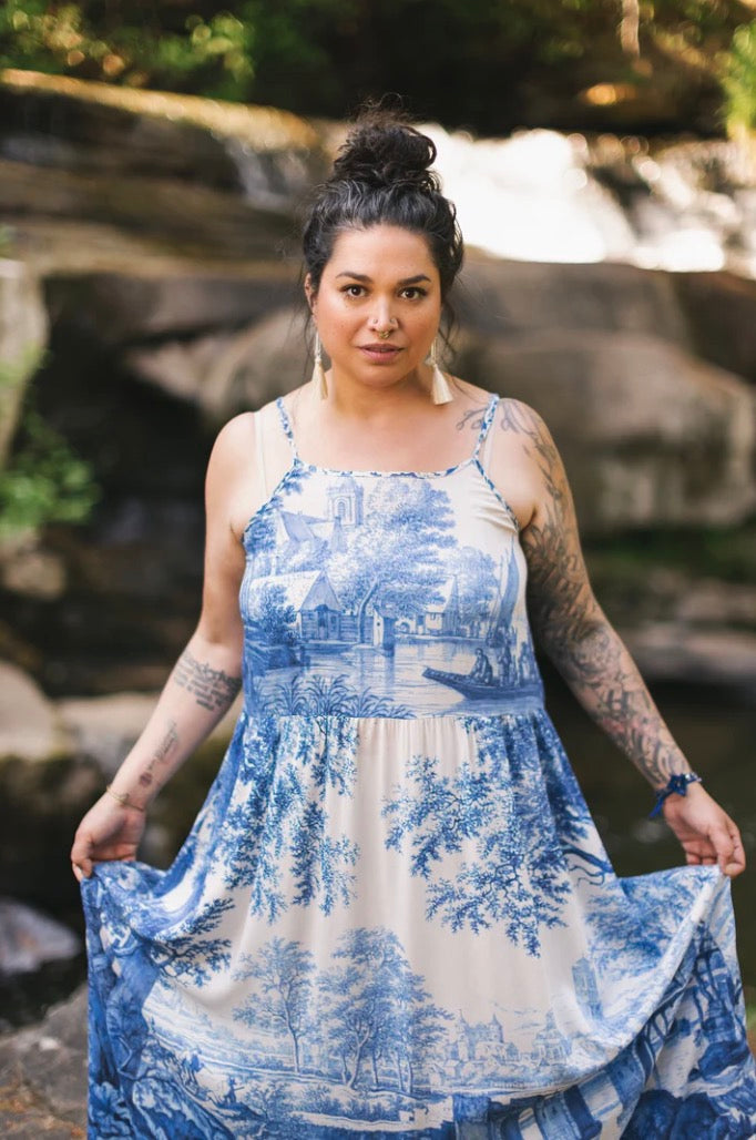 Adjustable straps. Dress measurements: S/M — length 132cm at shortest strap adjustment, 142cm at longest. Width 52cm (across bust, underarm to underarm), 54cm (across waist seam).