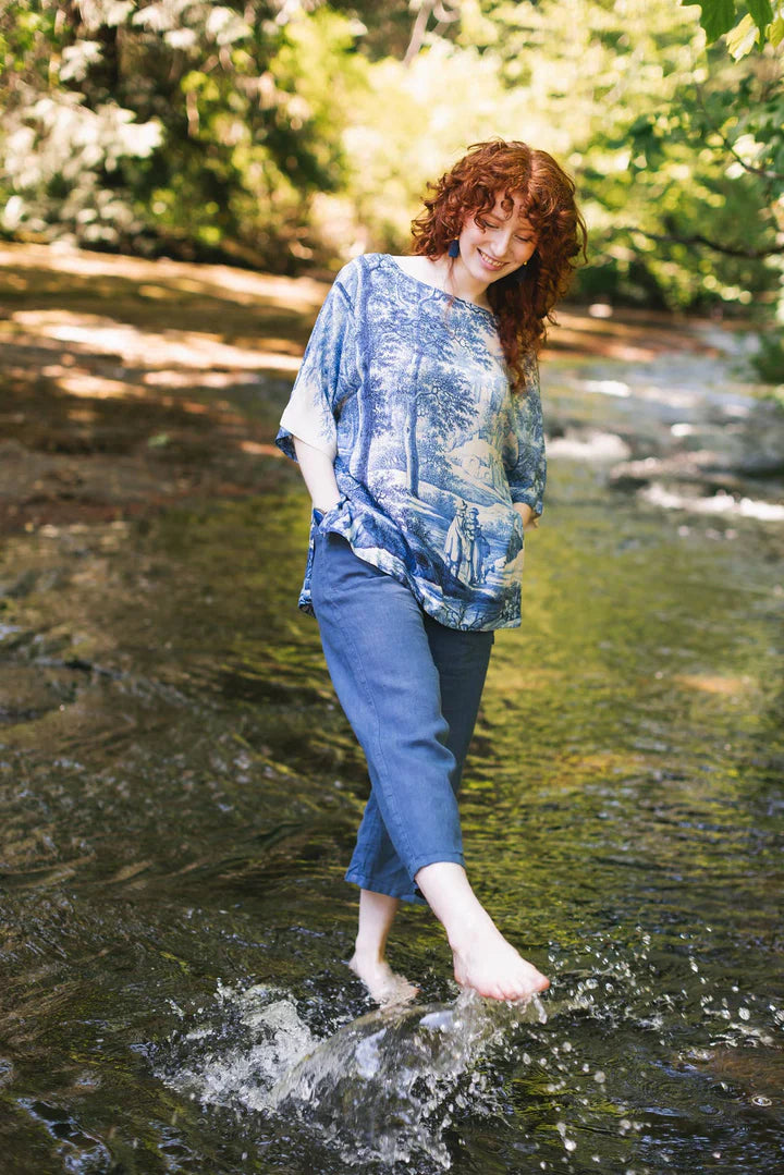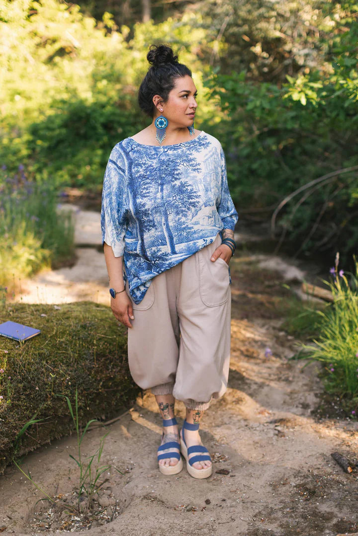Meet the Luxe Tee. We’ve taken a wardrobe staple — the humble t-shirt — and elevated it to a chic, easy piece with an oversized cut that’s destined to become a style you’ll reach for all year long! Inspired by poet Leonard Cohen’s famous quote “There is a crack in everything, that's how the light gets in”, this design celebrates the ways our experiences shape us, and the perfect beauty of imperfection. Created using pieces of Delft tile from the 1700’s — including two Italianate landscape scenes — we chose to leave in the cracks and slight imperfections from the original ceramic in our final print. The two patterns in the trim come from an 1867 British book on classical ornamentation, and an earthenware plaque from the Netherlands painting.
