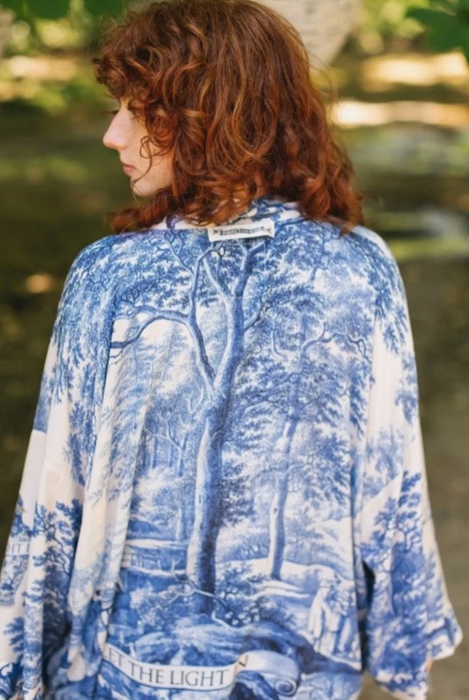Kimono measurements: length 58cm, width (across back, underarm to underarm) 74cm. Model is 5’5” for reference.