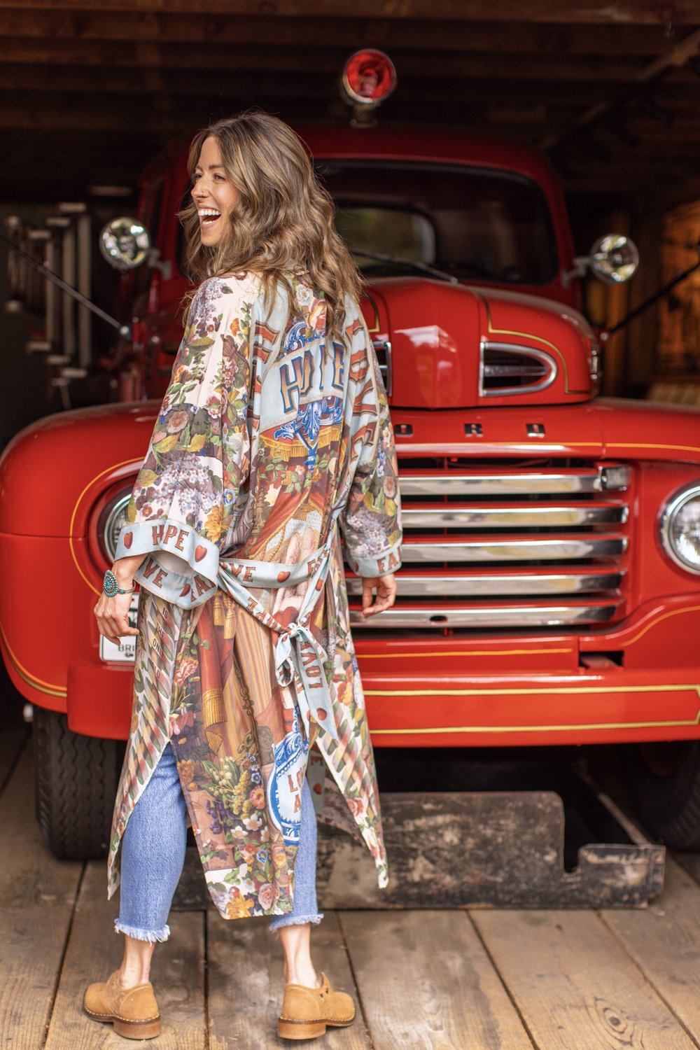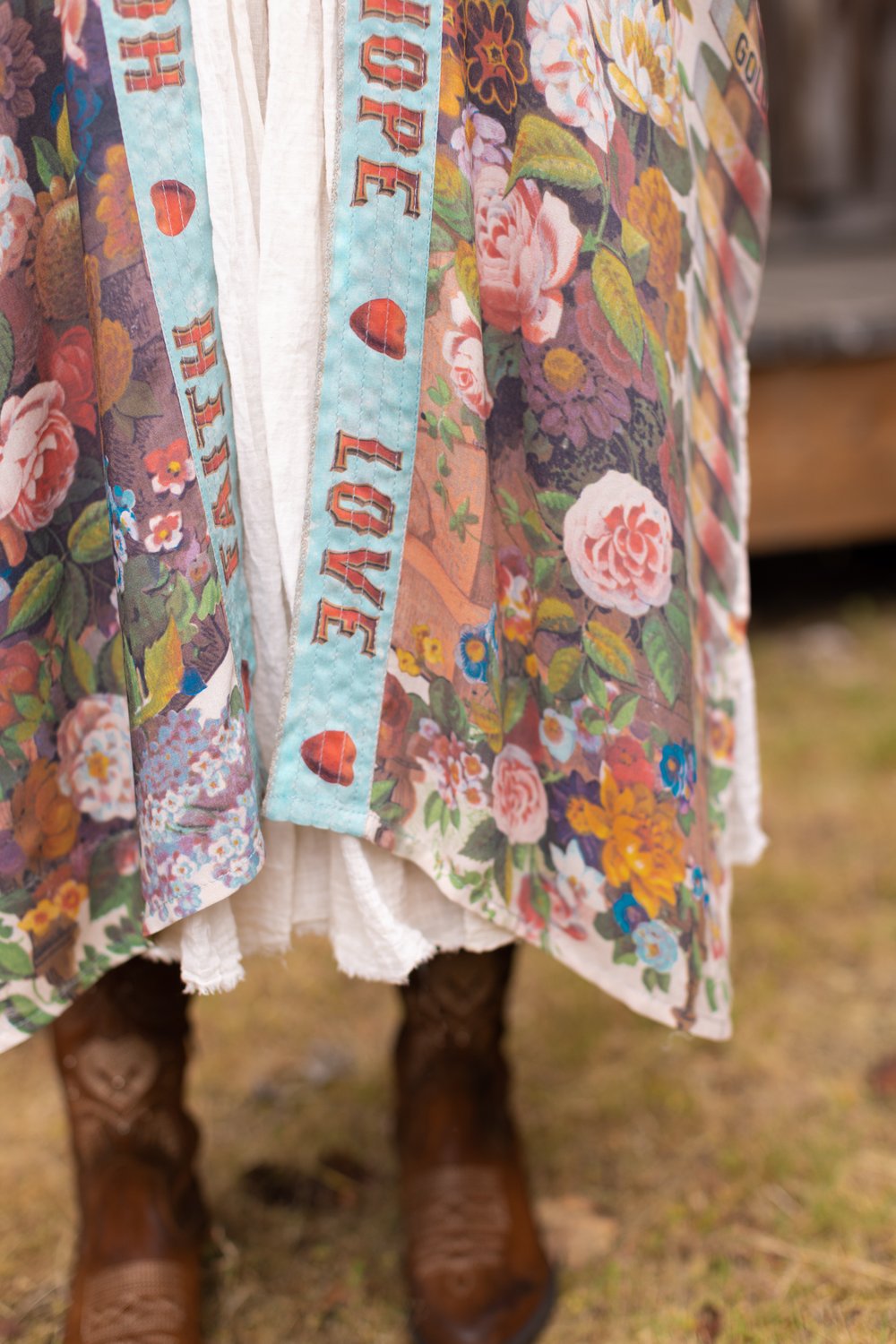 Joyful flowers, whimsical declarations of the heart, and unapologetic hope — this is our love language! The amazing artwork used for this piece was hand-drawn in Pennsylvania in 1854, and was originally created as a backdrop for a perfume and botanical extract display. We reworked the images and added our own touches — including the heart-in-hand (the symbol for kindness and charity), and messages in historic fonts (“Love is the only gold” and “Love one another”) to complement the original hand-lettering. The result is a true original: romantic, bohemian, and super cool.