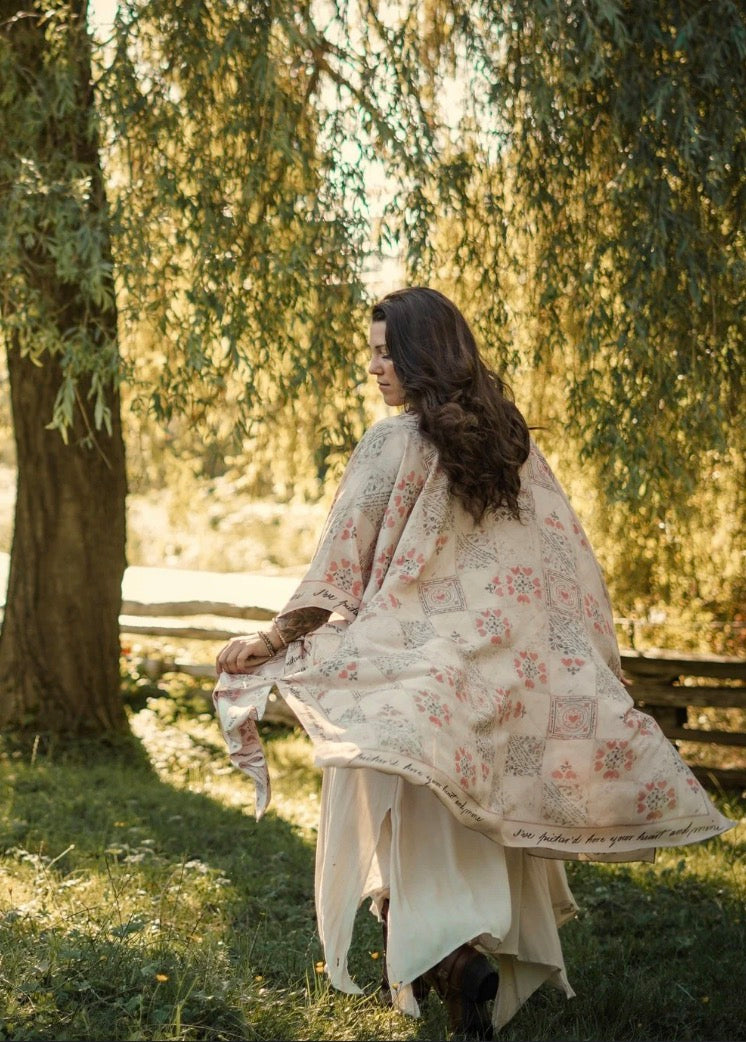 When we stumbled across a hand-drawn and coloured “puzzle purse” love letter that was over 200 years old, we were astonished by its romantic beauty. Made of paper, painstakingly decorated, and containing heartfelt declarations of love, it was carefully folded in to a pinwheel and had somehow managed to survive the last two centuries almost completely intact. Using all parts of the love letter, we carefully designed a captivating and pretty patchwork pattern, then trimmed it with pieces of the original poetry reconstructed from the author’s charming handwritten script. It reads: