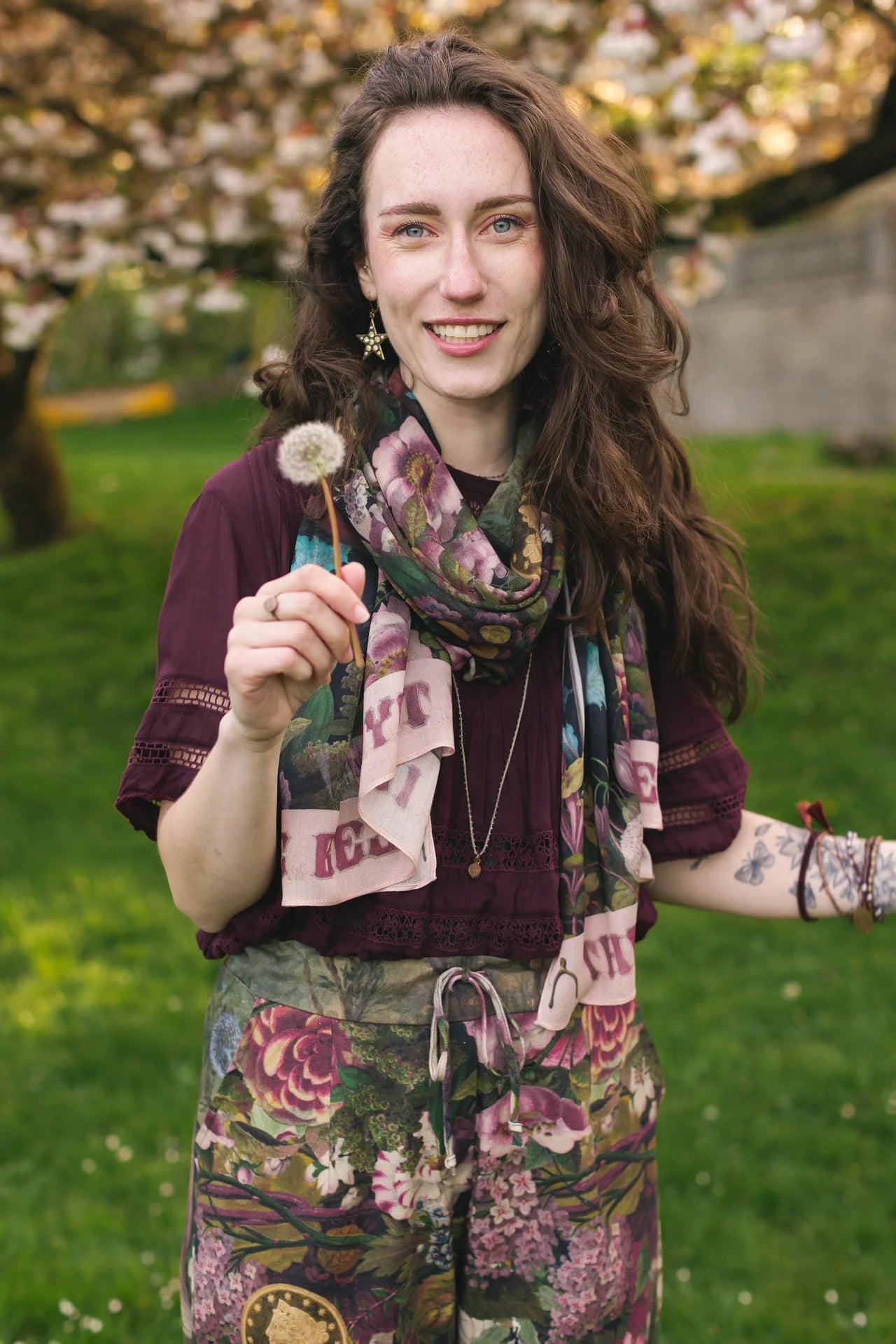 Full of magic, this whimsical design combines several symbols of good luck from antique artworks— including a gold wishbone from a Victorian postcard, an 1840’s coin, an evening star, and a beautiful painting of a dandelion waiting to be wished on. The banners reading “Make a wish with me, the best is yet to be” come from an 1880’s etching, and the spring flowers are symbols of hope and renewal. May this piece bring you luck and joy whenever you wear it!