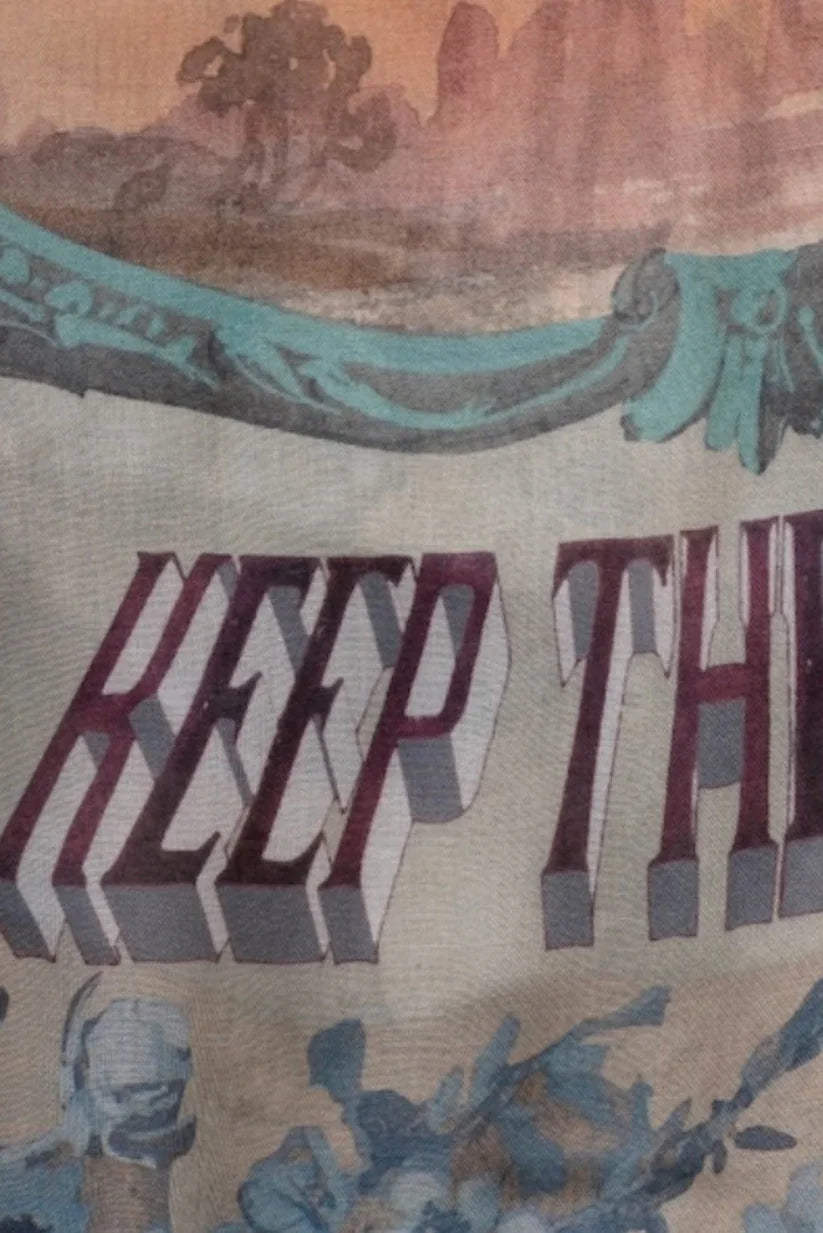 The soaring dove, and enduring symbol of grace and peace, is taken from an 1881 lithograph. To finish this happy design, they added the words “Keep the Peace” and “Peace Out” (as well as a few classic peace-signs) as a nod to the 1960’s and a reminder to practice peace!