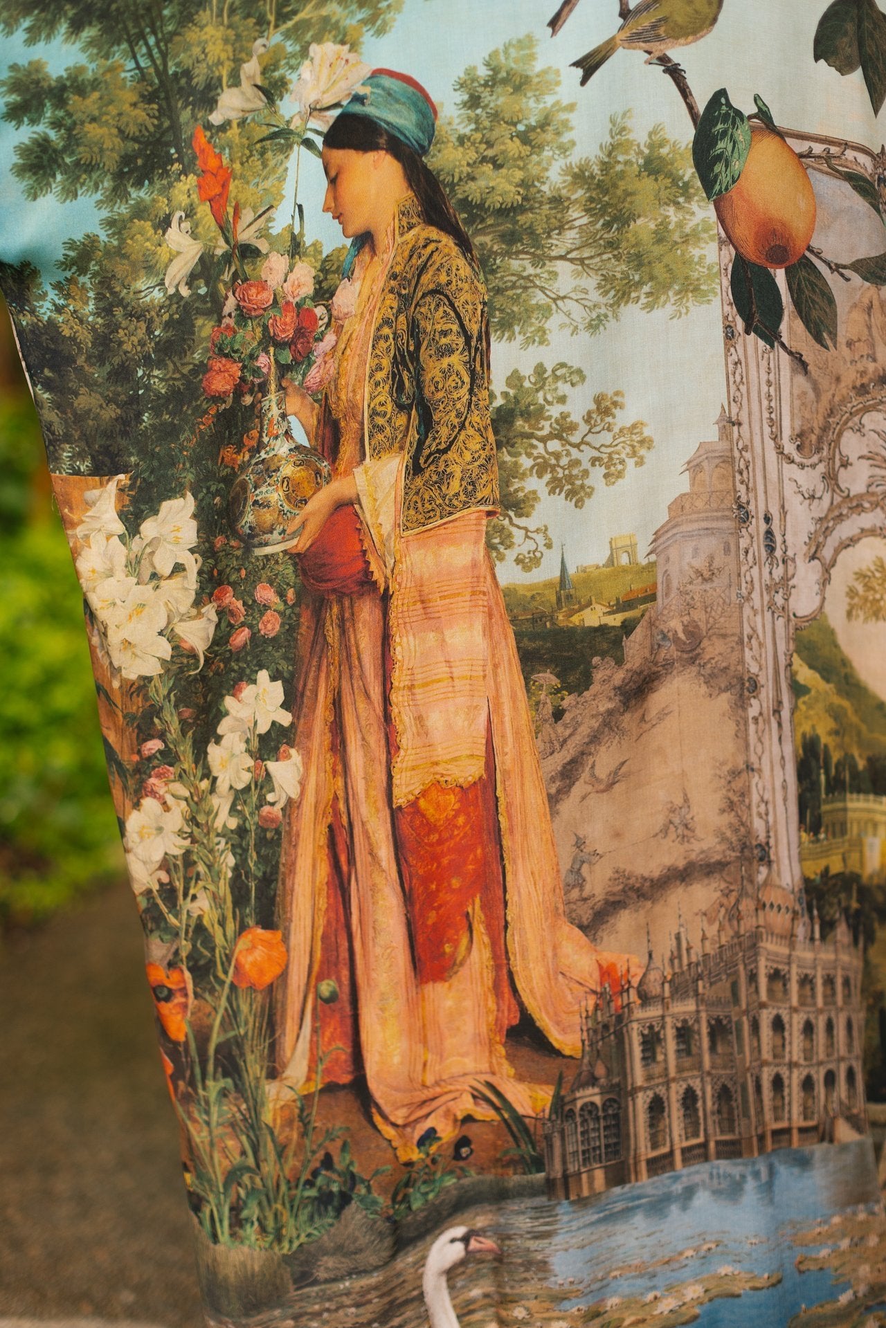 Vibrant, exotic and luxurious — welcome to our secret garden! This imaginative piece features the image of a woman in resplendent dress carrying lilies through her garden, which was painted in 1871. The architectural elements, including the spired chateau and decorative wall panels were painted during the same era, and the charming swan comes from a drawing done in 1580. The beautiful branch with oranges and birds comes from an antique Japanese woodblock print. The trim combines two different French textile prints from the 1800’s... and for a final, whimsical flourish, we added the image of a pair of embroidered velvet slippers and a Parisian fan, both circa 1900.