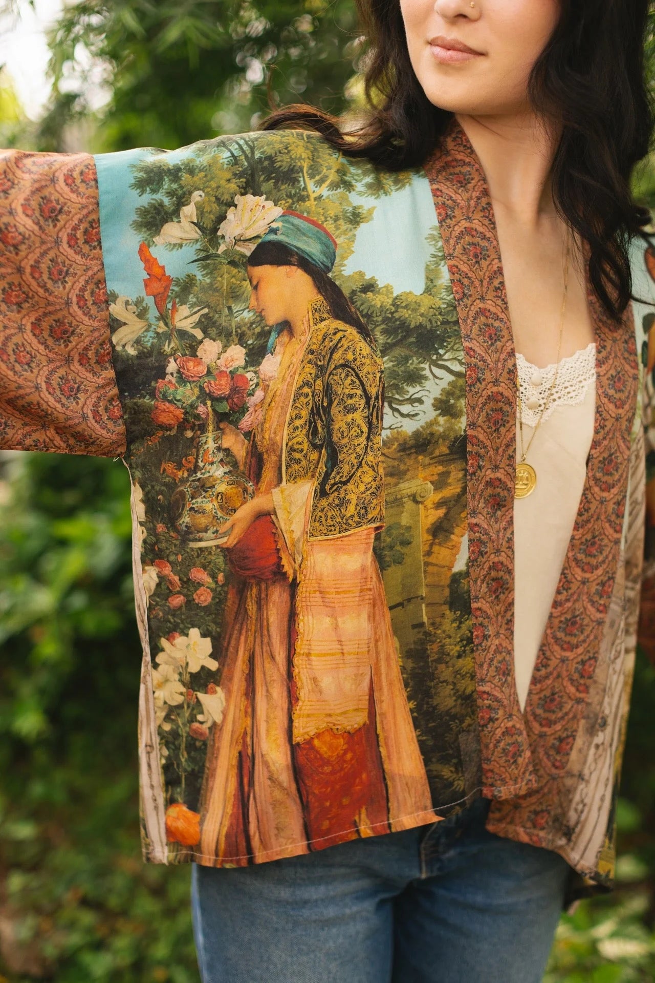 Vibrant, exotic and luxurious — welcome to our secret garden! This imaginative piece features the image of a woman in resplendent dress carrying lilies through her garden, which was painted in 1871. The architectural elements, including the spired chateau and decorative wall panels were painted during the same era, and the charming swan comes from a drawing done in 1580. The beautiful branch with oranges and birds comes from an antique Japanese woodblock print. The trim combines two different French textile prints from the 1800’s... and for a final, whimsical flourish, we added the image of a pair of embroidered velvet slippers and a Parisian fan, both circa 1900.
