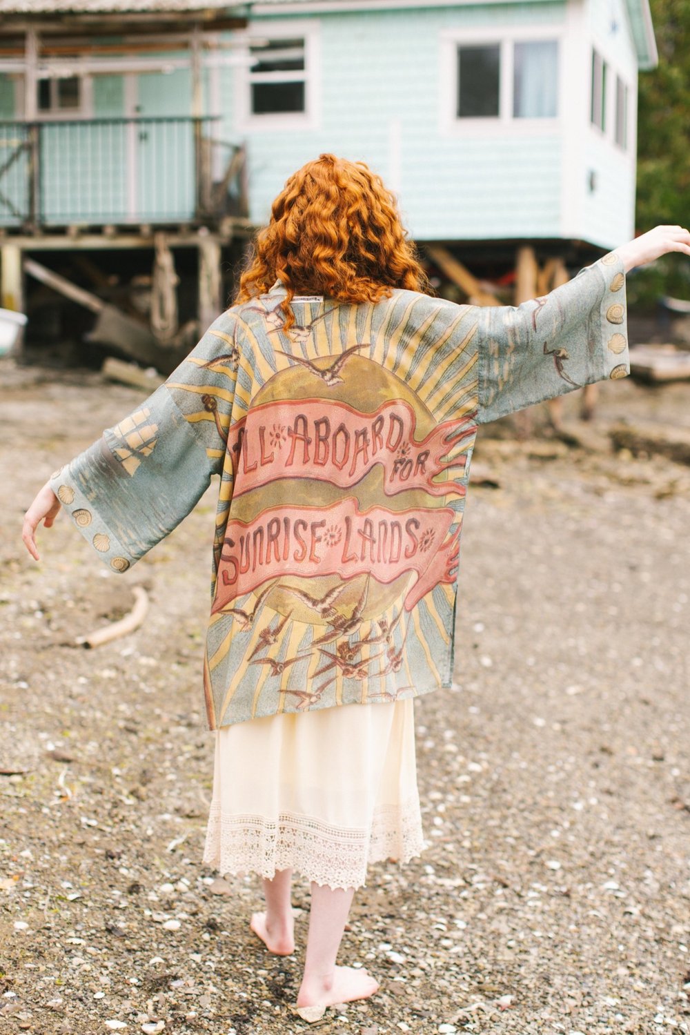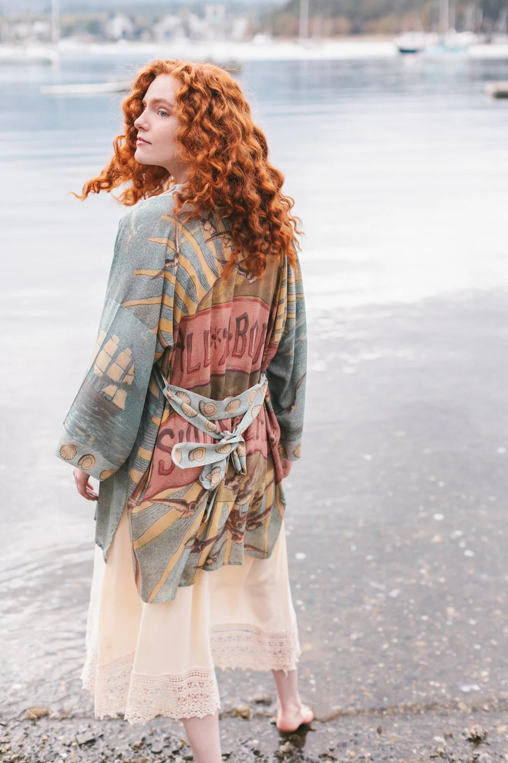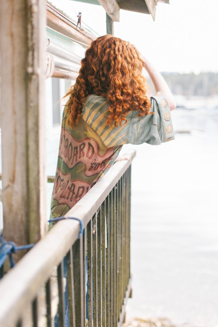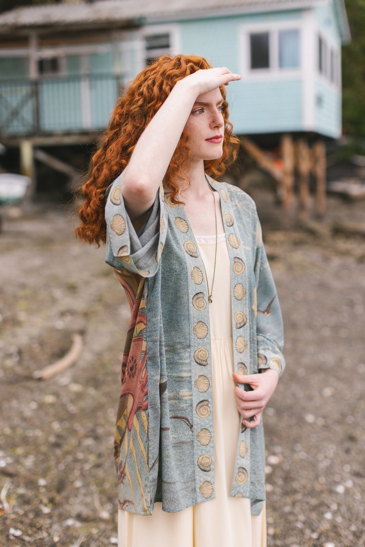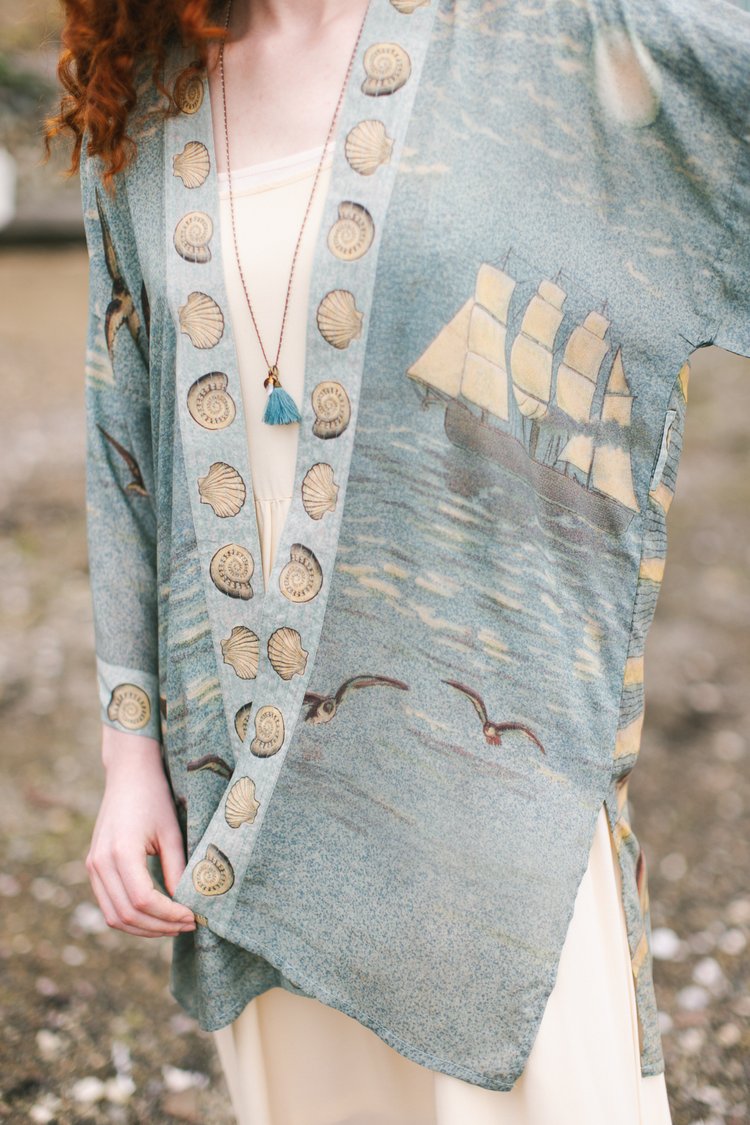 A lighthearted, joyous nod to adventure and sunny holiday travel, all aboard for Sunrise Lands! The nautical artwork on this whimsical design comes from an 1880’s children’s travel book, and features a charming sailing ship, breezy banners, and a radiant sun. The lovely little mermaid was taken from a print entitled “The Looking Glass of Venus” by Sir Edward Burne-Jones from the same era. We trimmed the entire piece in hand drawn nautilus and scallop shells from an antique French sketchbook. The result is full of happy, vaycay feels, and beautiful oceanic colours.