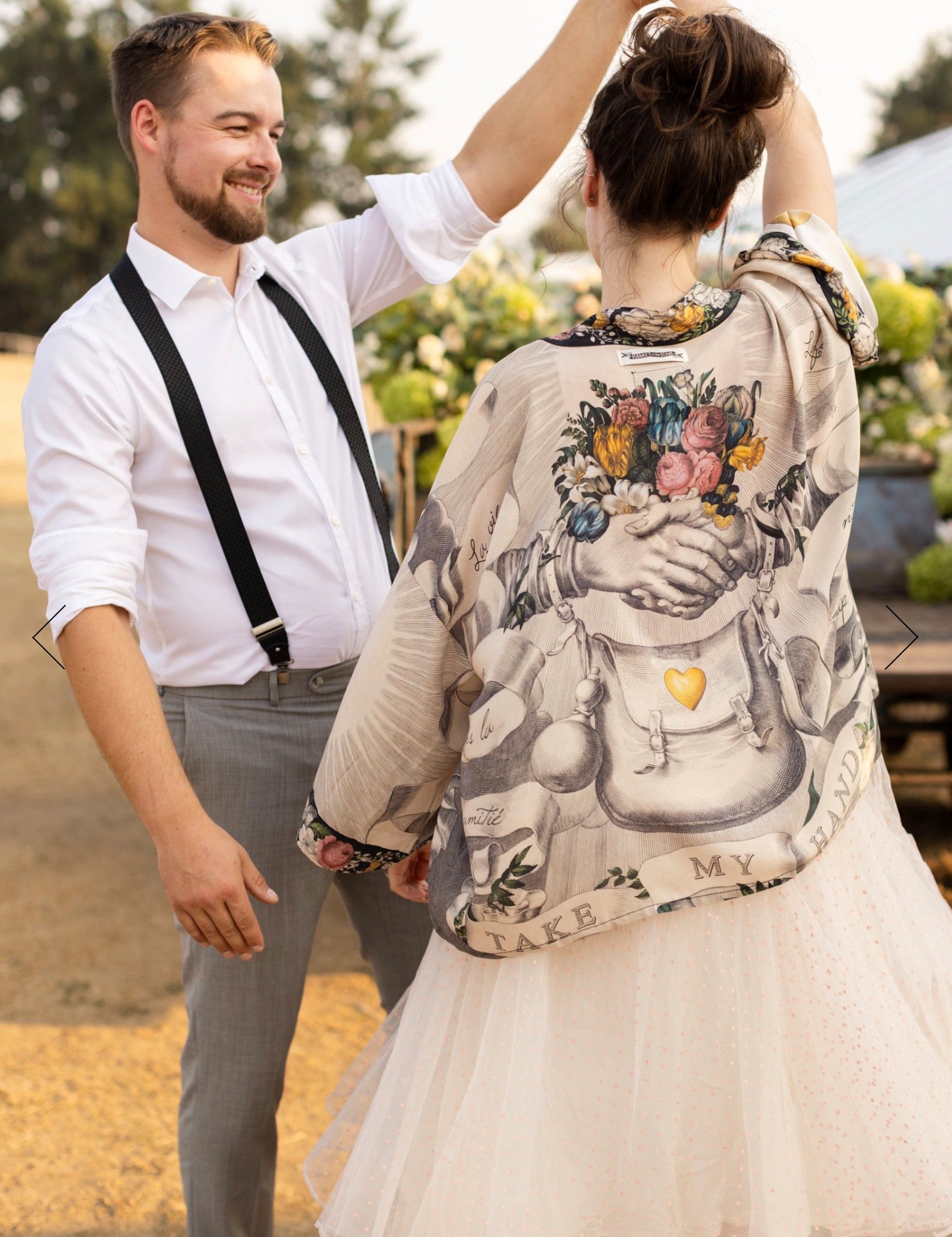 A splendid and wholly original ode to friendship, this lighthearted design has quickly become one of our very favourites! We combined several pieces of art in the tradition of Victorian collage — including a remarkably detailed engraving of clasped hands, sun rays, and a buckled satchel from 1626, a painted heart from a seventeenth-century colour chart, and flowers from an 1800’s lithograph. The banners on the front reads, in both English and French, “La vie n’est rien sans l’amitié — Life is nothing without friendship”. The trim combines more hand-coloured 1800’s florals collaged together. The resulting print is so fresh and joyful — and unlike anything we’ve made before.