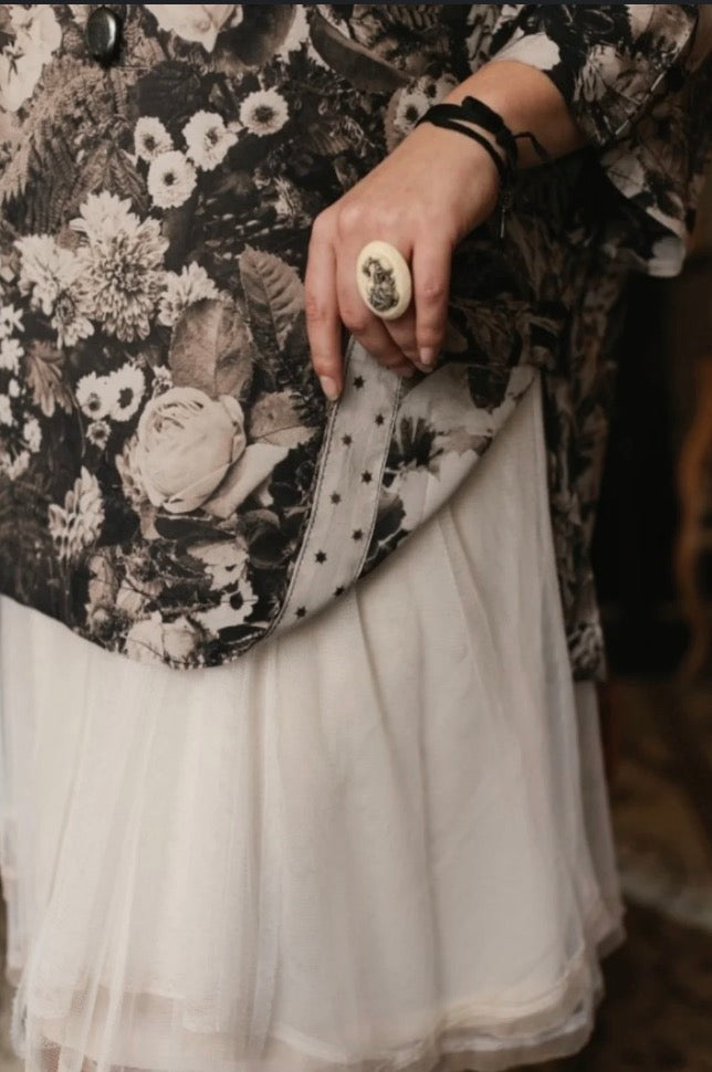 The moon that graces this design originates from a historic 1800s photograph by the Harvard Observatory, and the star-kissed trim, including the delicate embellishment on Alice’s collar, finds its roots in a fragment of wallpaper from the same era. History and romance entwine, creating a poetic narrative within the threads of this stunning creation.
