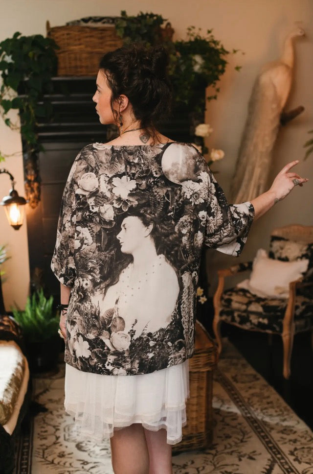 In this one-of-a-kind print, discover the delicate beauty of rare antique flower and foliage photographs, accompanied by a mesmerizing portrait of Alice Liddell. Captured in 1872 by the influential Julia Margaret Cameron, this portrayal of Liddell in her grown-up elegance reflects a belief close to our hearts — that, regardless of the passage of time, Wonderland awaits, timeless and ageless.
