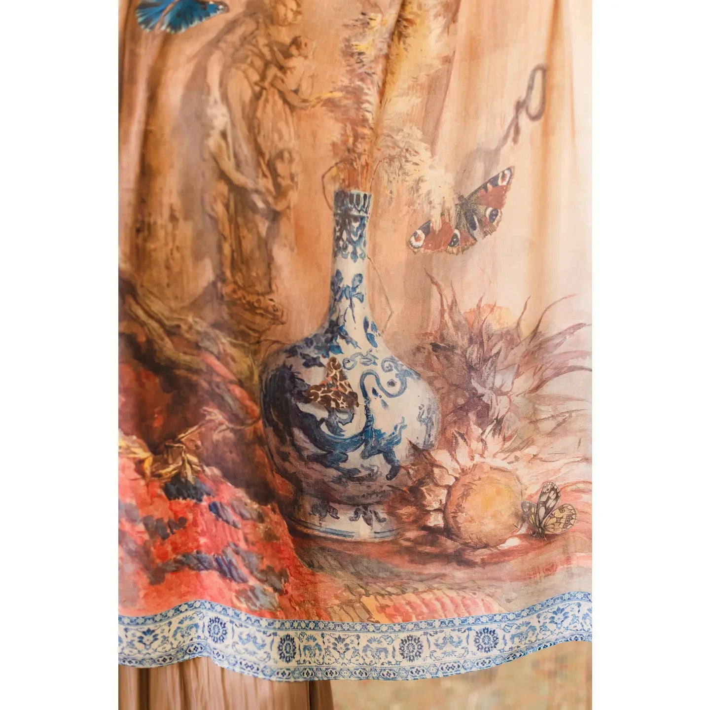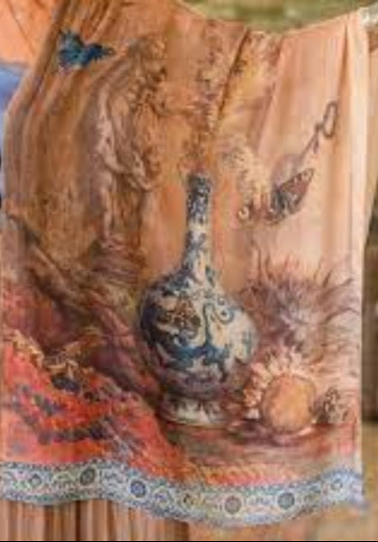 Inspired by art, travel, and timeless style, The Storyteller Scarf is a rich tapestry of colour and pattern. Featuring a stunning mix of prints—including a watercolour painting by Dutch artist Maria Vos, an antique Turkish carpet design, and a French Chinoiserie plate—this piece is a beautiful blend of history and artistry.