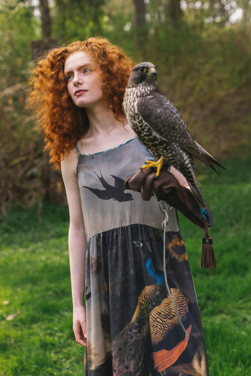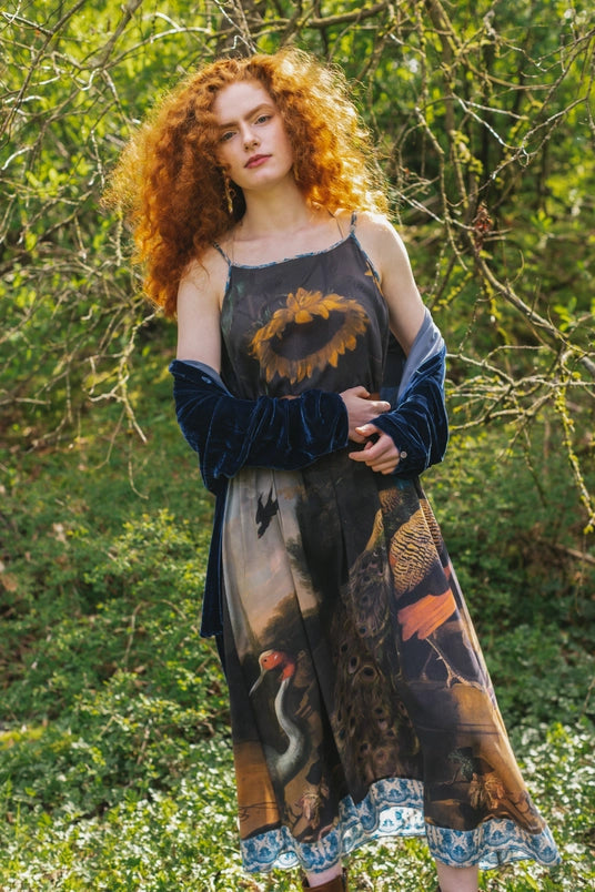 Majesty, luxury, and good luck! Peacocks — symbols of strength, confidence, luck, and royalty — have been celebrated for their glorious and colourful plumage throughout history. This remarkable piece features joyful, deliciously rich artwork from the 1600’s by dutch painter melchior d’hondecoeter, and is trimmed with a print we created using a reconstructed french textile fragment from the same era. This dress is reversible! Wear it with the bird or the sunflower on the front, depending on your mood :) Please note: the nature of our soft bamboo/wood viscose means it’s slightly sheer, so we recommend wearing a full or half-slip with this style. 100% bamboo viscose. Measurements for s/m: 136cm long, 52cm wide underarm to underarm. L/xl: 142cm long, 57cm wide underarm to underarm.