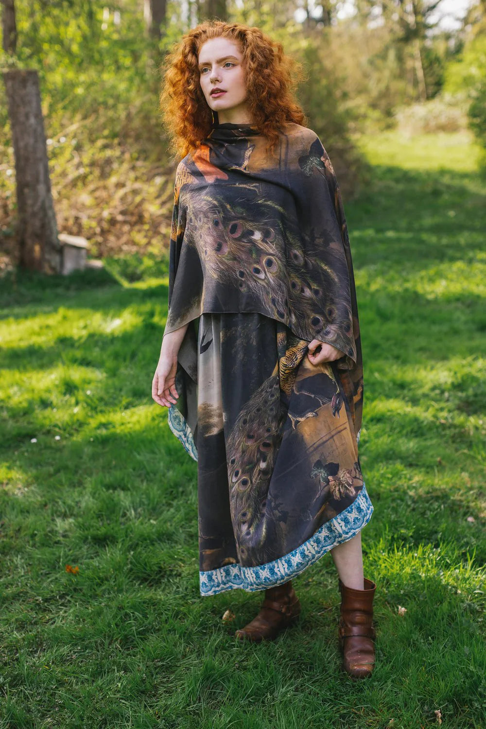 Majesty, luxury, and good luck! Peacocks — symbols of strength, confidence, luck, and royalty — have been celebrated for their glorious and colourful plumage throughout history. This remarkable piece features several dramatic, deliciously rich artworks from the 1600’s by Dutch painter Melchior d’Hondecoeter in a lush palette of crimson, ochre, black and cerulean blue. The whimsical trim is a peacock toile print we created using a reconstructed French textile fragment from the same era.