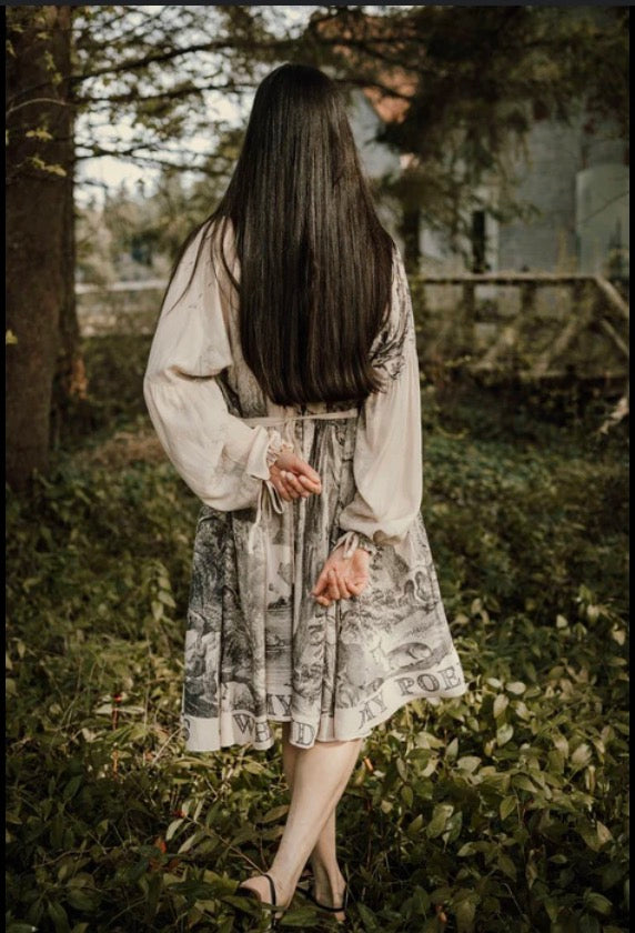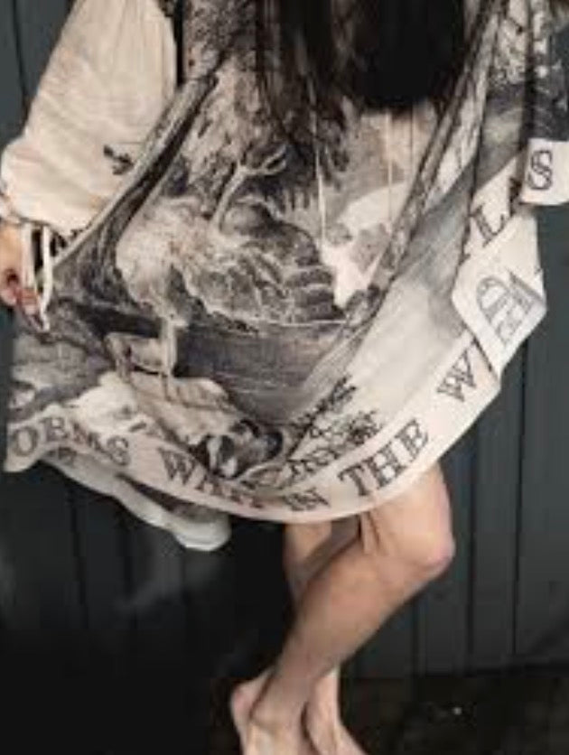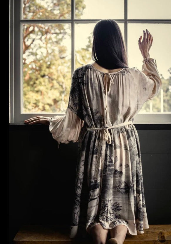 Market of Stars borders a hundred acres of wild woodland, where we can often be found roaming through the trees and dreaming up new designs. This soft, ethereal dress was developed using an archival print from the 1870s entitled “The Home of the Deer” — a work that perfectly captures the calming majesty of the forest. We deconstructed it to create the panels on the dress, with songbirds and sunshine on the sleeves. The bottom reads, ‘My poems wait in the wild places where my heart wanders’, but — because this dress is reversible — it can also be read as ‘Where my heart wanders, my poems wait in the wild places’.