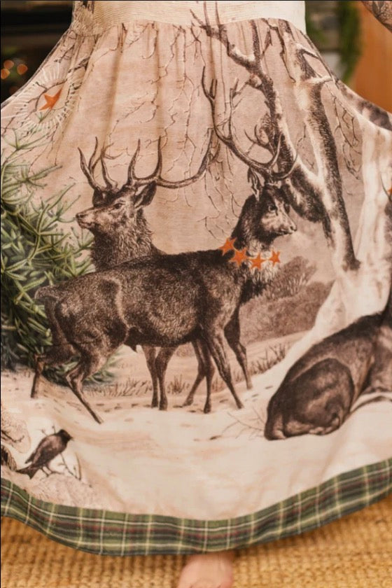 Market of Stars created this Limited Edition nostalgic, vintage print to celebrate the magic of the holidays, and the tradition of welcoming light and joy in the dark of winter. Featuring Victorian-era images from holiday greeting cards — including reindeer in the snow, a perfect little fir tree, golden stars, and traditional plaid trim — it’s charmingly festive without being over-the-top! This design is delightful for lounging and entertaining throughout the holiday season, but we’ll also be layering it up with cozy knits and boots for everyday wear. It’s a wonderful life ;)