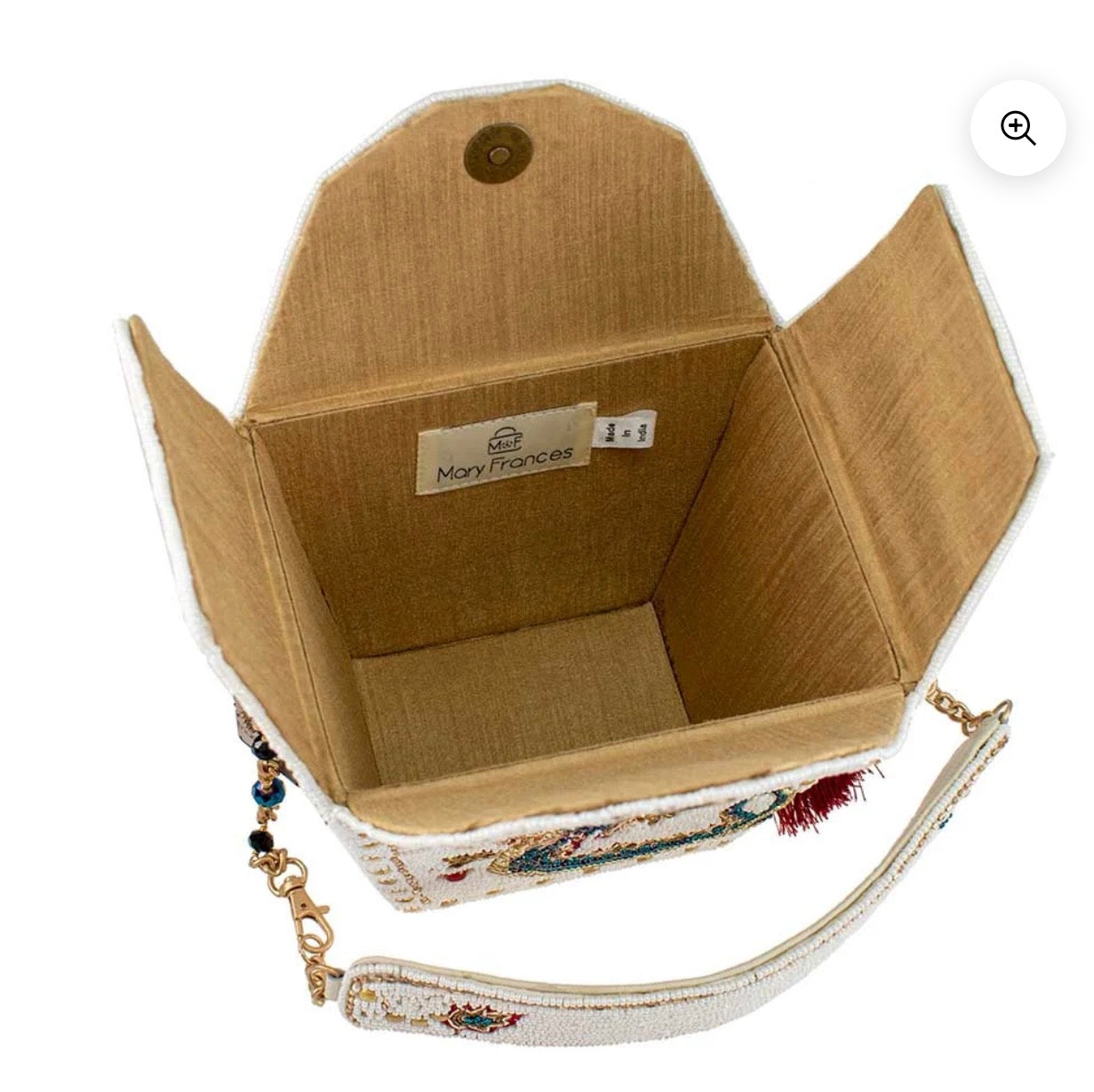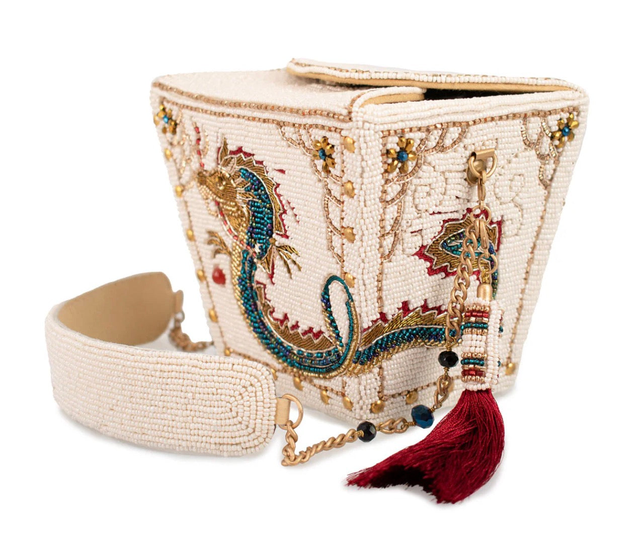 Inspired by the iconic Chinese food takeout container, this unique accessory features an intricate embellished dragon motif with elegant embroidered detailing making it a captivating blend of ancient traditions and modern fashion.