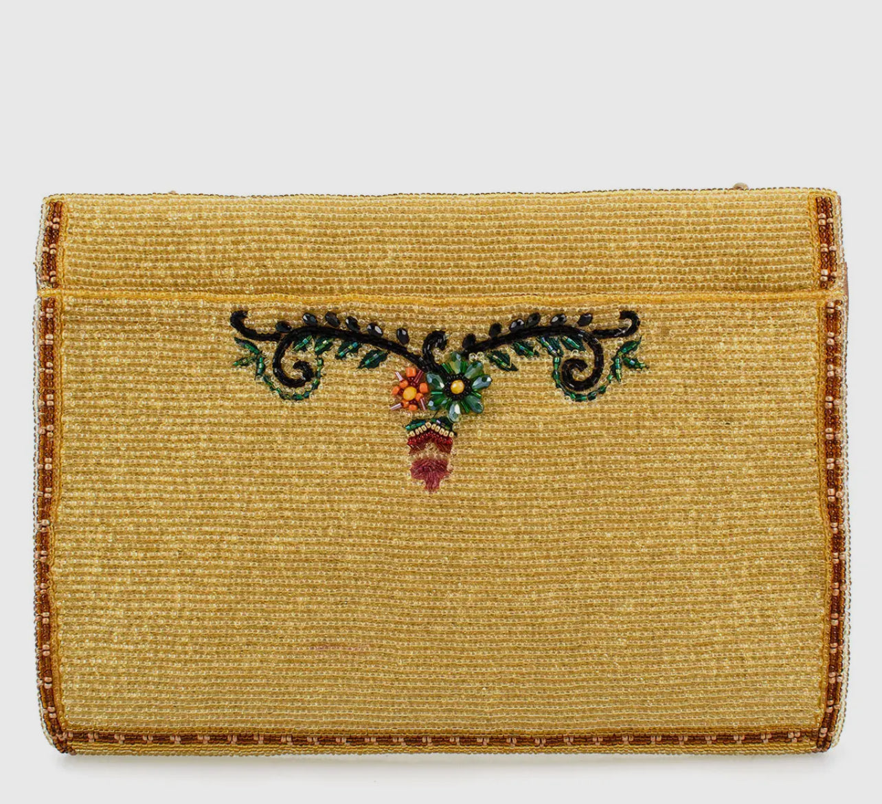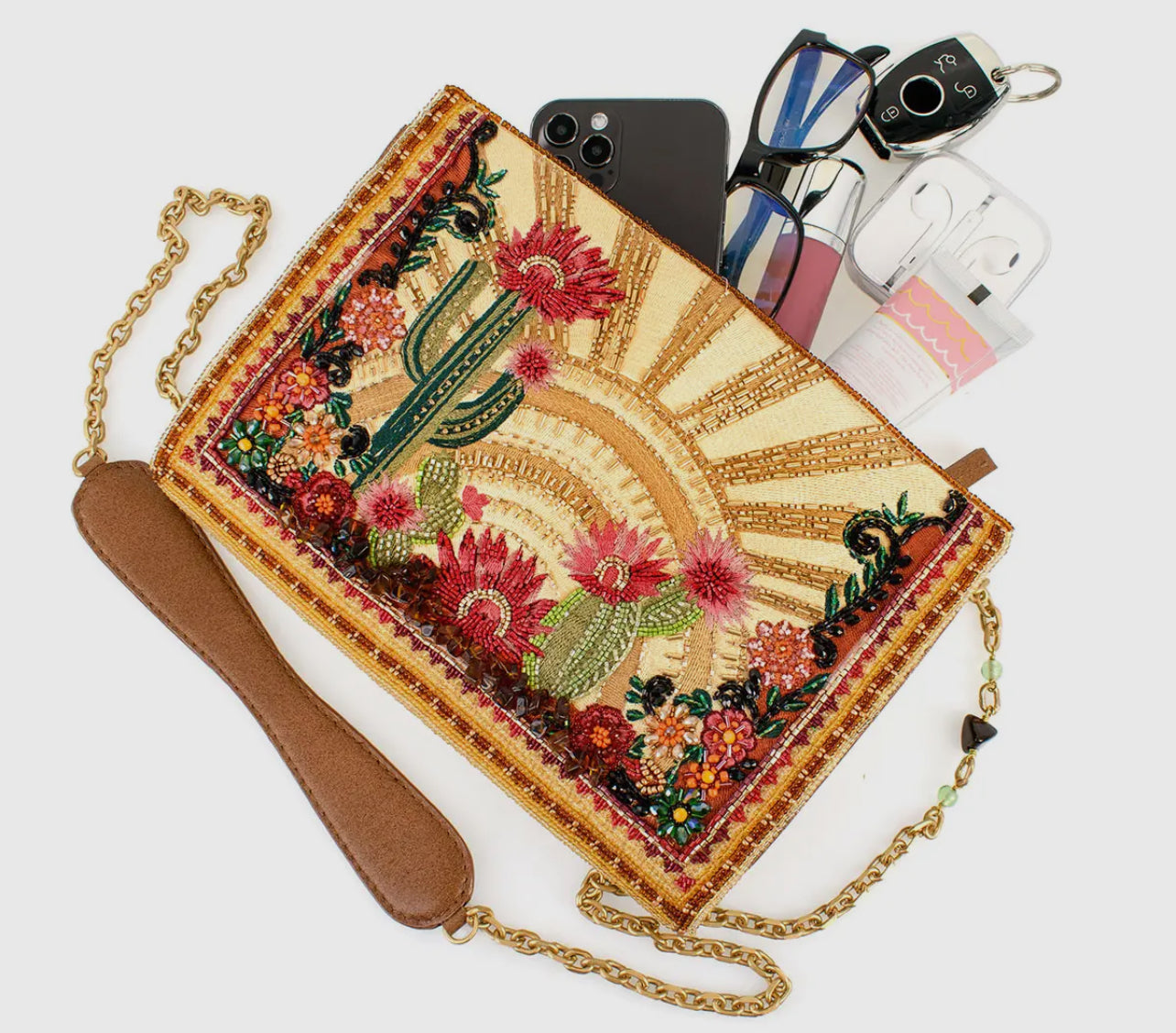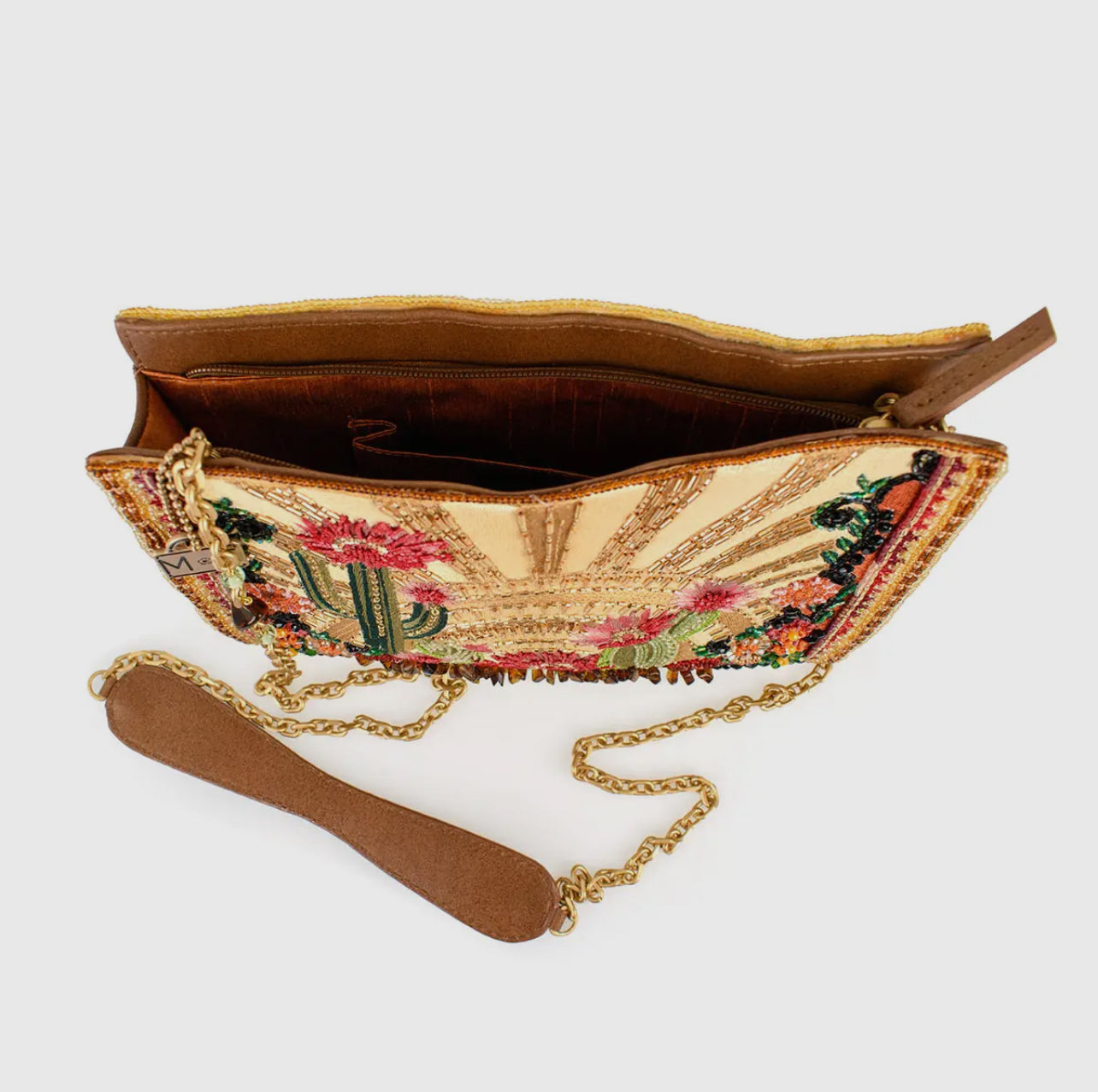 Adorned with embroidered blooming cacti and sparkling sun rays in warm, golden earth tones, this crossbody clutch is a true desert-inspired masterpiece. A removable chain strap with a padded leather shoulder piece ensures comfort, while leather sides offer a roomy interior. A secure inset zipper keeps essentials safe while maintaining its sleek silhouette.