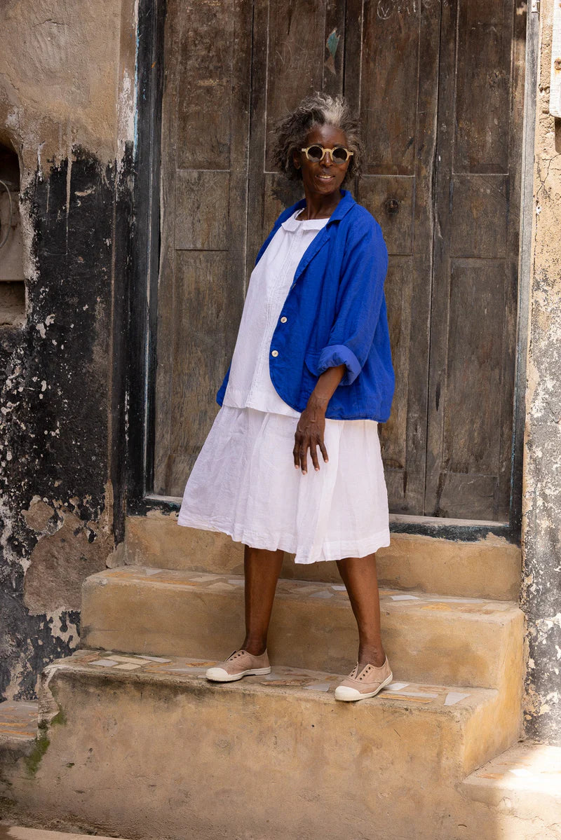 Our Baridi Jacket is crafted from medium-weight linen and fully lined with soft paper cotton for comfort and the breathability that comes from natural fabrics. It features a classic collar and our signature agoya shell buttons, bringing a subtle elegance to its relaxed, easy silhouette. Perfect for layering over our tops, it adds an elevated pop of freshness or colour to your outfit.