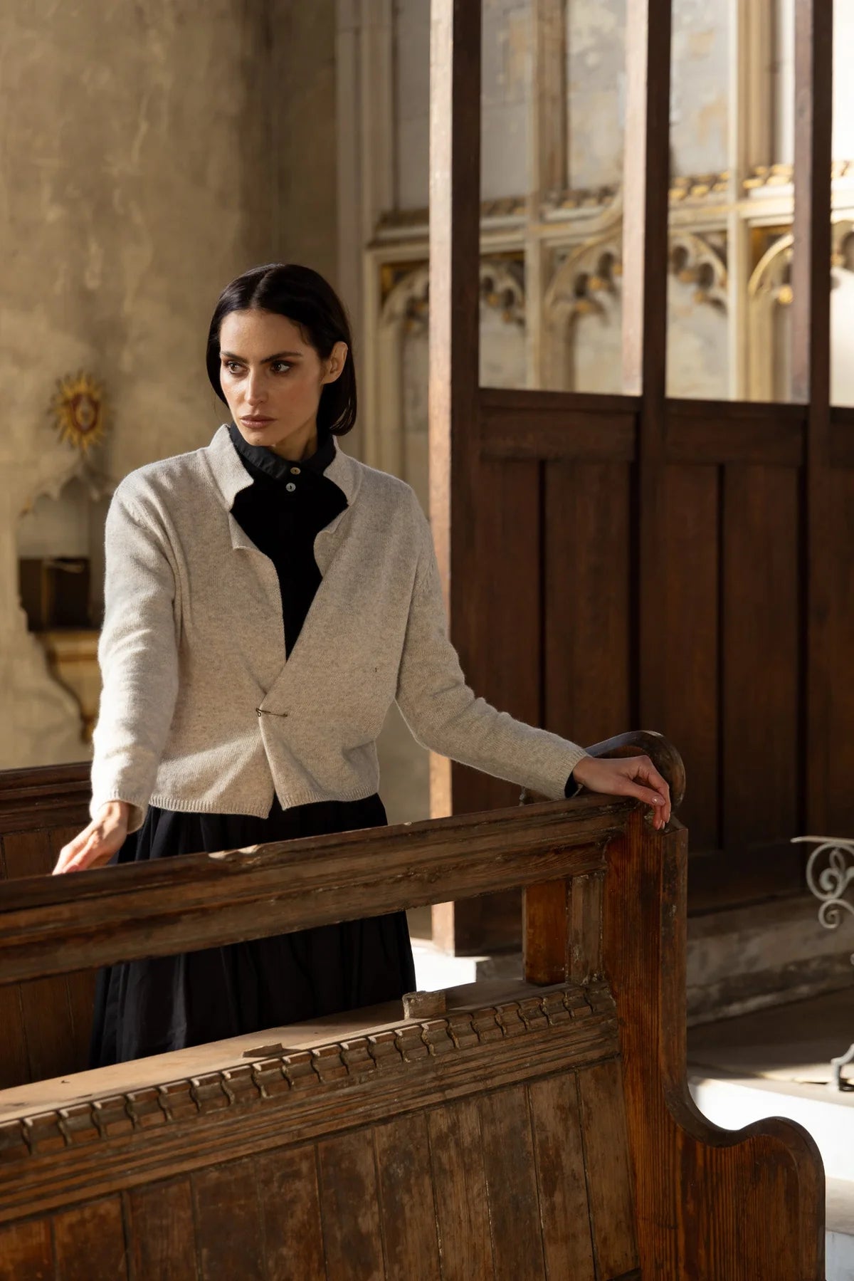 Our Binx Cardigan is made from medium-weight 100% wool and includes a metal pin for closure that allows for changeable styling. It features a small, relaxed collar and lapel. The design is intended to layer easily over various pieces from different collections.
