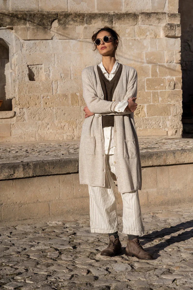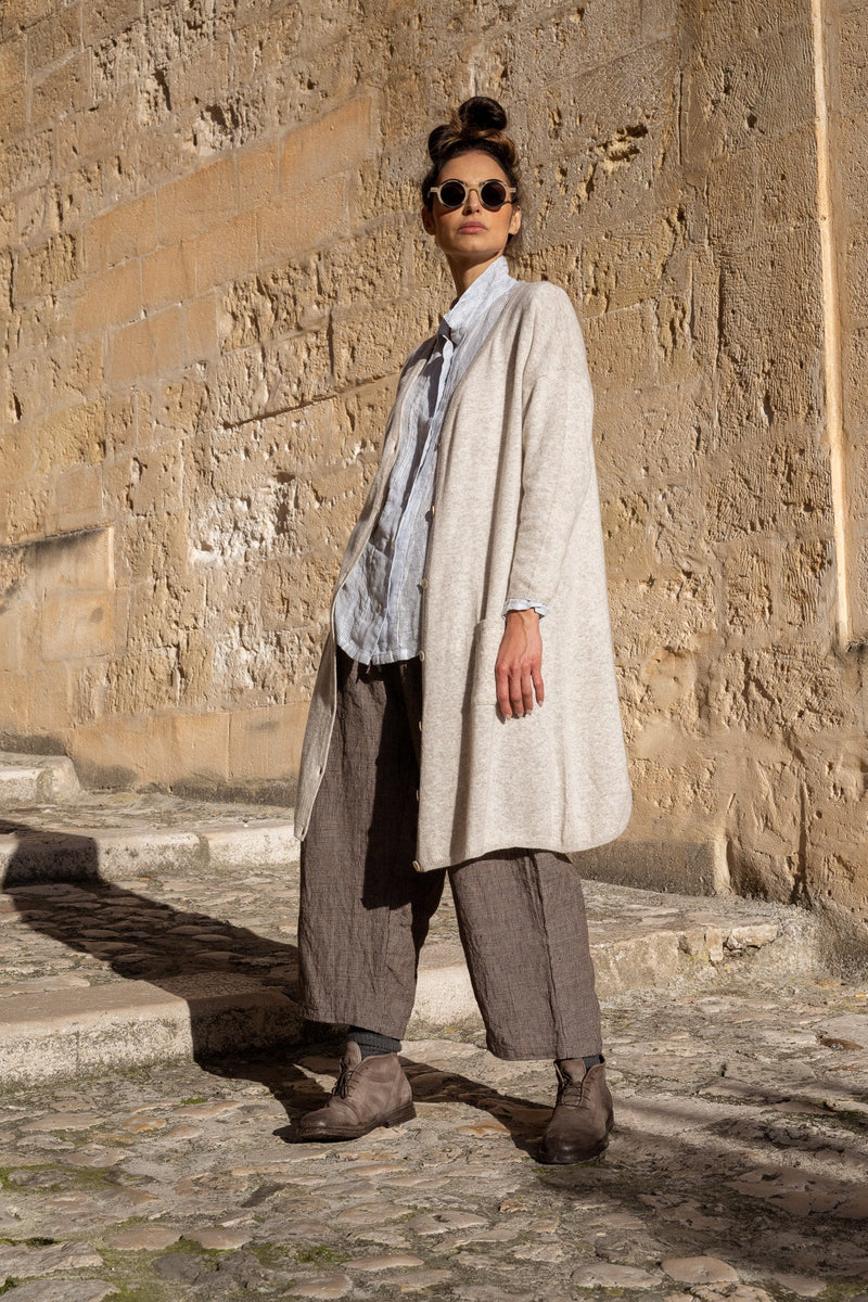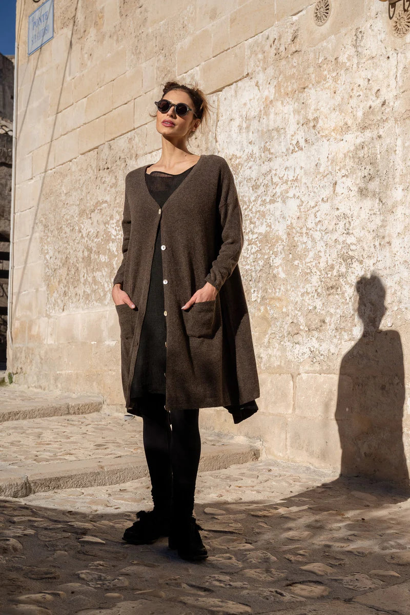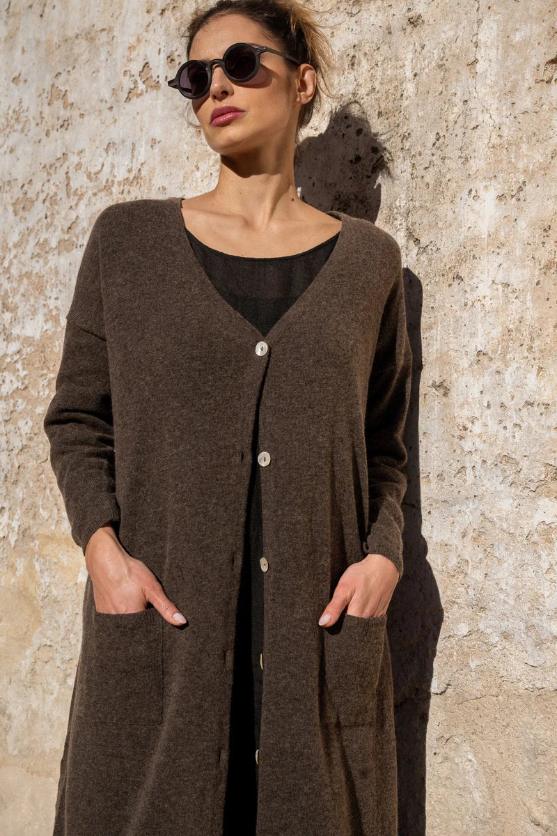 Ellery Cardigan is made from a 100% merino wool. It is available in oatmeal, brown and soft black.