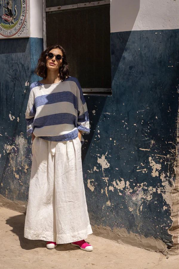 Our Harriet trousers are crafted from a beautiful medium weight linen They feature a wide-leg design and two spacious pockets. The waistband includes a linen belt and is elasticised at the back. The cut offers the flexibility to be worn either low or high waisted. The feel of the linen is incredible and along with the cut and material allow for breathability in the warmer months and the ability to pop on a pair of thermal tights underneath for warmth in the colder months.