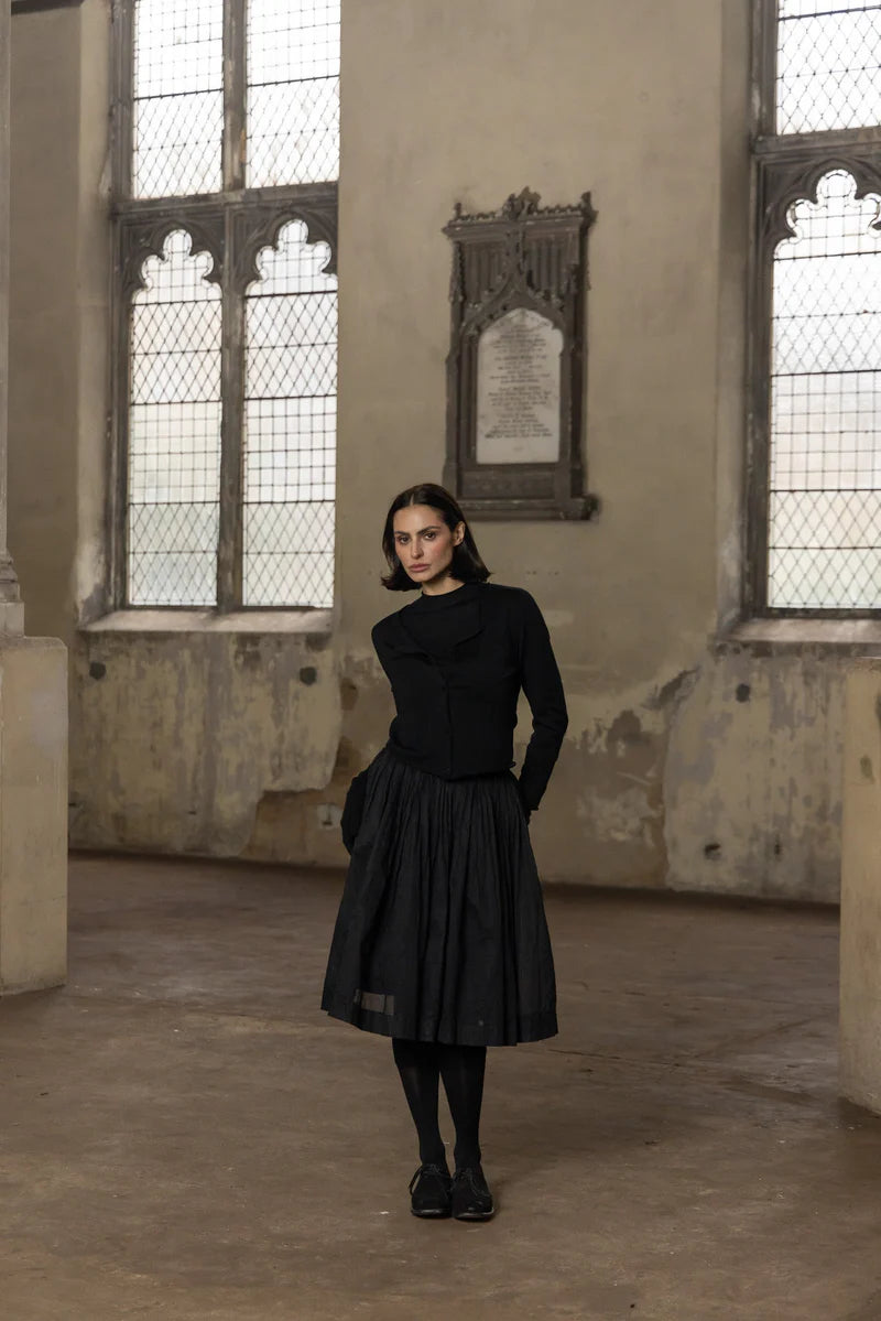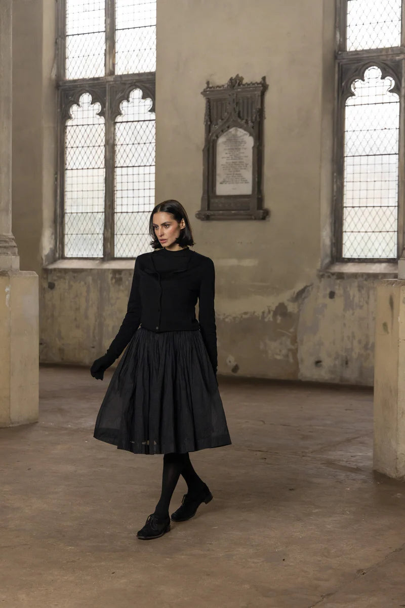 Our Nyx Tutu Skirt is a modified version of our much loved and classic Tutu Slip, featuring a textured organdy fabric layer over a cotton poplin lining. This design includes a wide, secure elasticised waistband, providing an easy fit and easy styling options. The skirt maintains a structured silhouette while allowing for versatile styling, suitable for a range of occasions from casual wear to black-tie events.