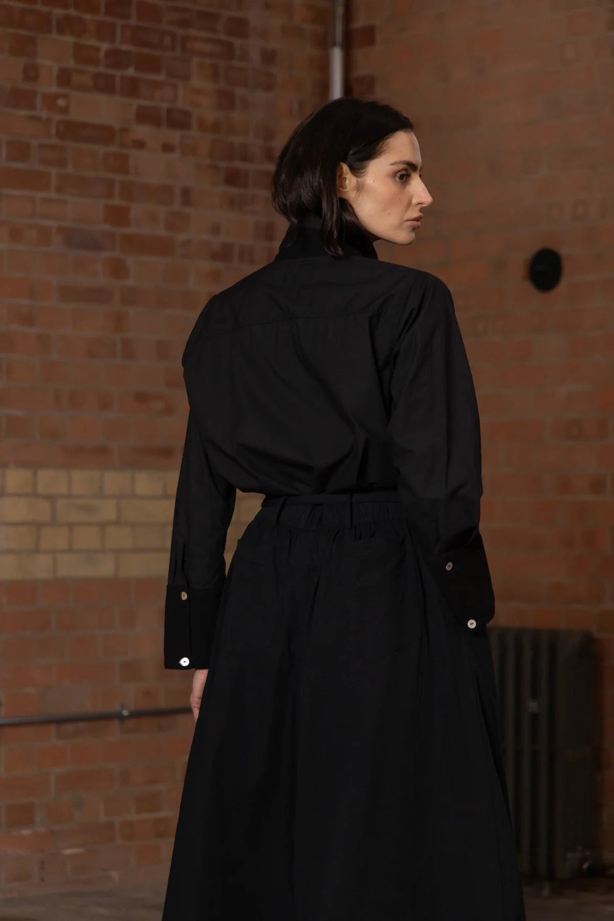 The Winifred shirt is crafted from a sturdy cotton poplin, with a cotton waffle fabric on the bust and cuffs. The exaggerated collar is reinforced, allowing it to be worn popped up or left open by unfastening the buttons. The side splits allow for ease of movement, added dimension and a more flexible fit.