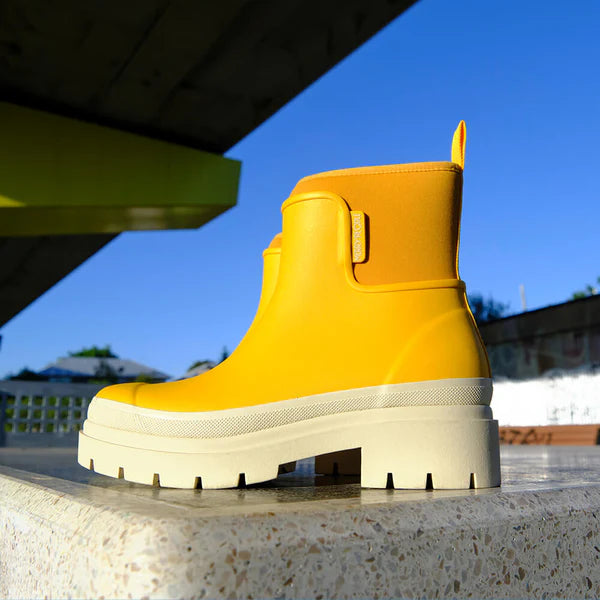 The Tully Boot’s distinct silhouette is a fashion forward take on the classic gumboot! Playful and urban; Tully nods to 90s nostalgia with a chunky platform-style sole and an extended, wrap around neoprene cuff.