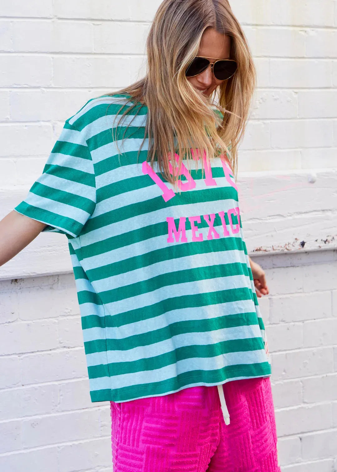 This tee is a total throwback in the best way. With bold green and light blue stripes and a pop of hot pink “1976 MEXICO” across the front, it’s giving vintage souvenir tee meets cool street style. The fit is oversized and relaxed — made for casual summer days.