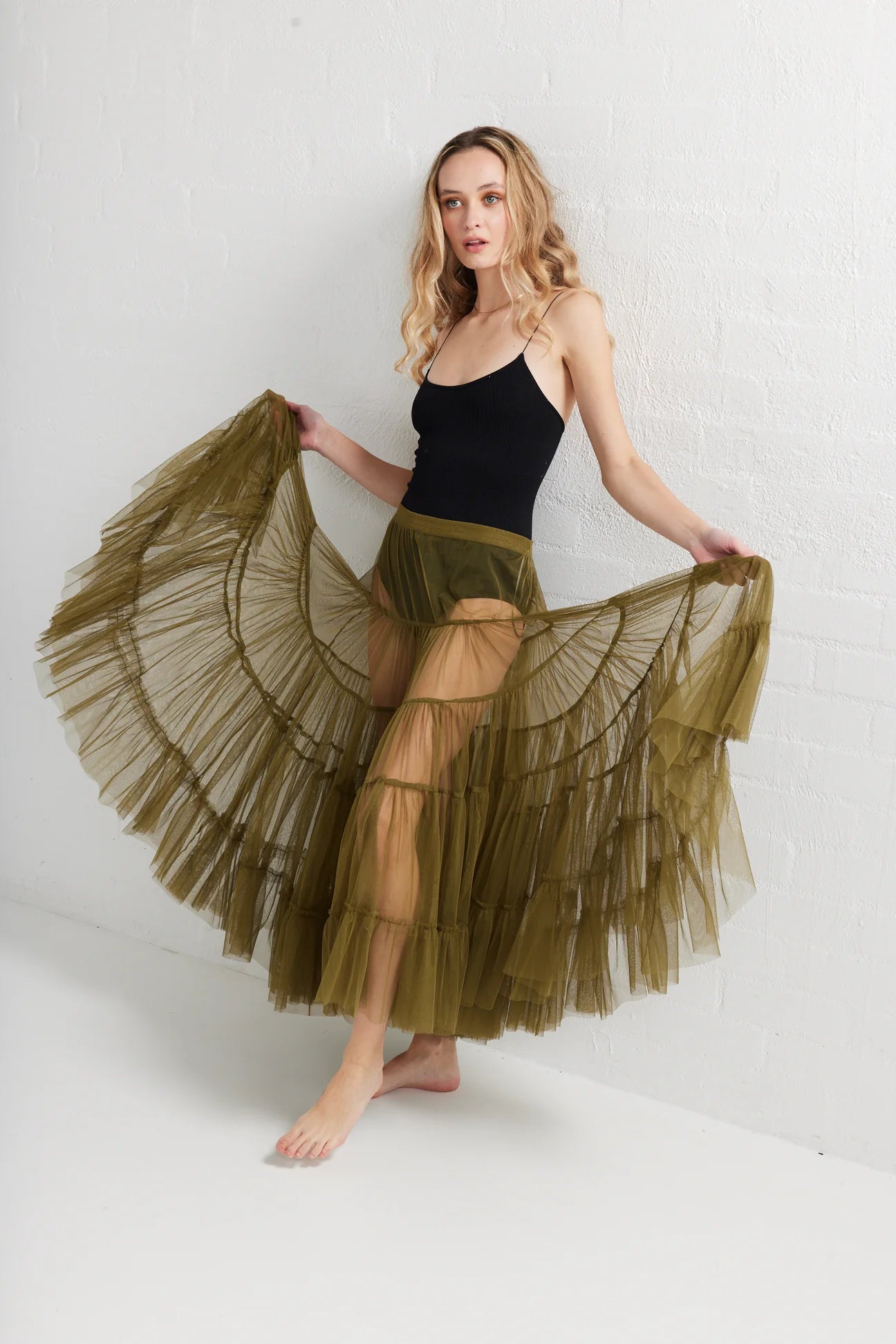 Extravagant, ethereal, very full tutu made from the softest net tulle ....falling in layers around you ...its like a cloud surrounding you, swirling and falling beautifully softly ...it is a tutu made for a Princess ...can be worn over leggings or a lace slip ....can be worn also like a petticoat underneath other articles of clothing ...