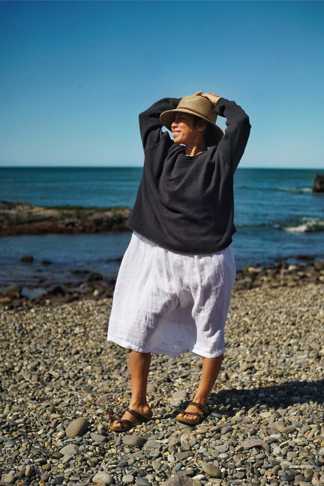 Our model Sara is 5'3" and Jun in mustard is 5'7".