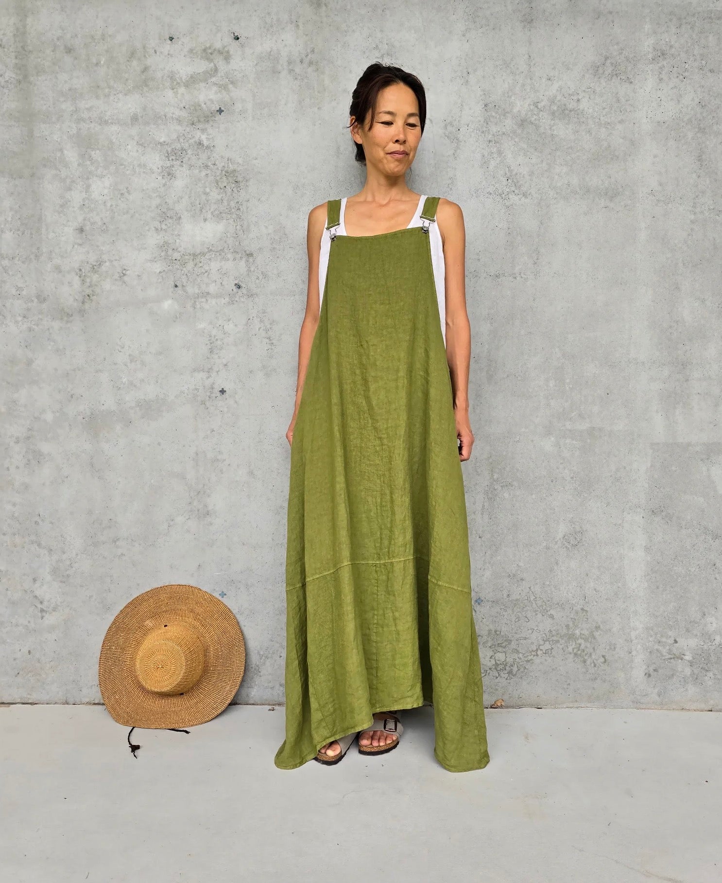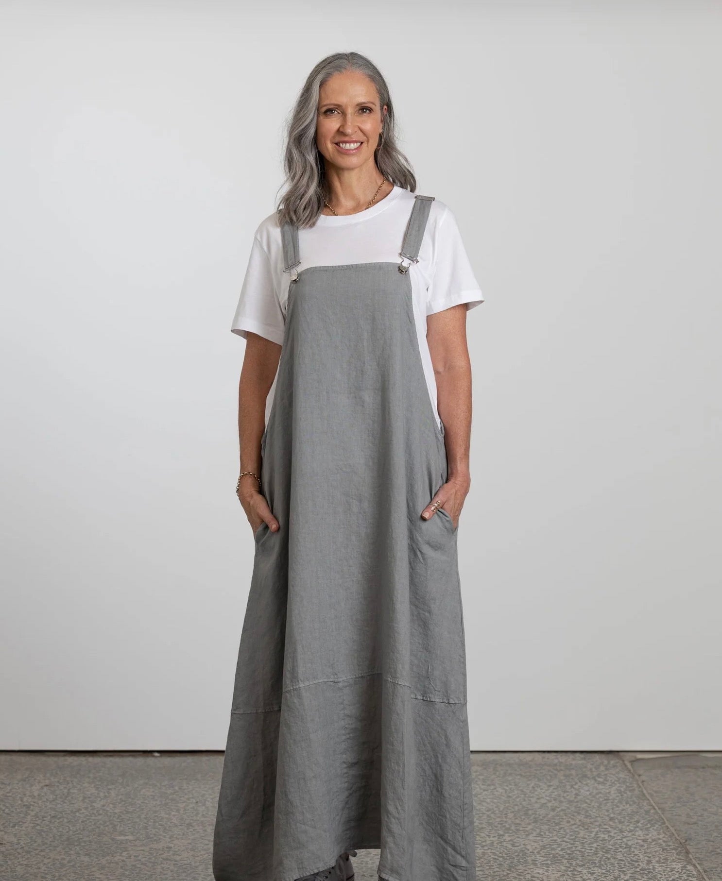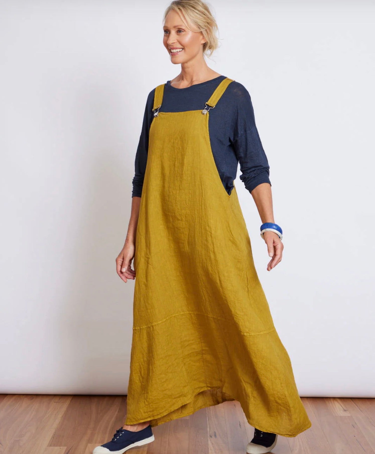 A fresh twist on the dungaree trend, our popular linen maxi dress is super fun to wear, and comfortable too. A relaxed fit, we pair it with a classic white tee - or striped - and our favourite Bensimons, and we're out the door.